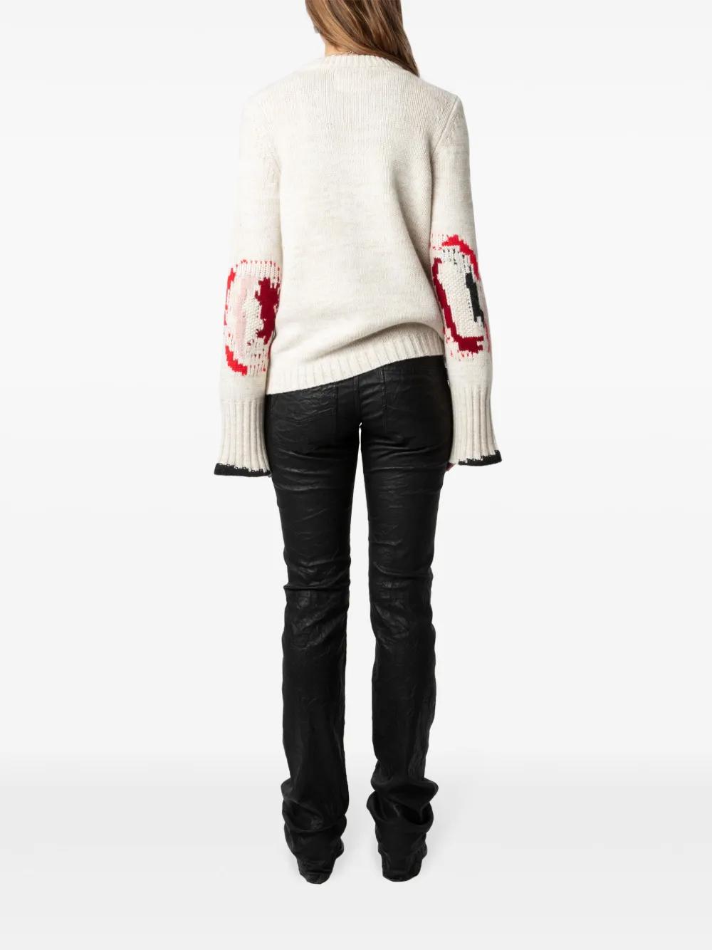 oatmeal beige cashmere blend fine knit intarsia knit round neck front button placket long sleeves ribbed cuffs and hem