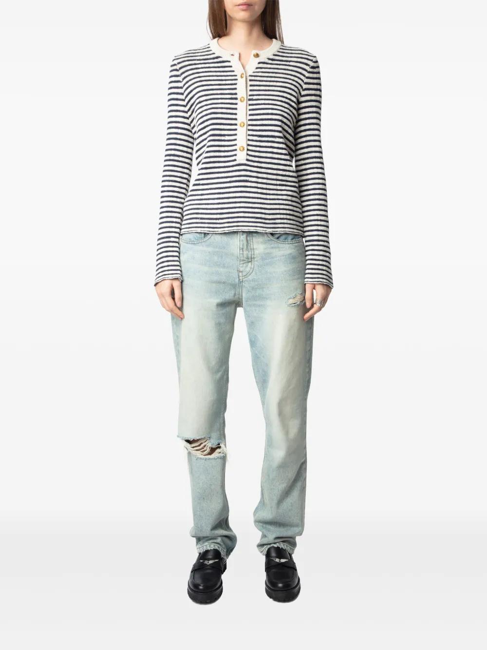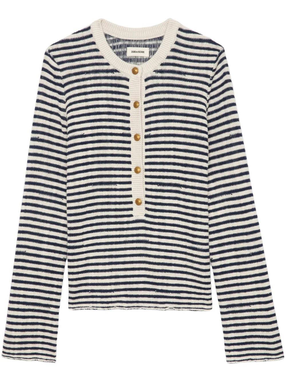 white front button placket crew neck long sleeves horizontal stripe pattern