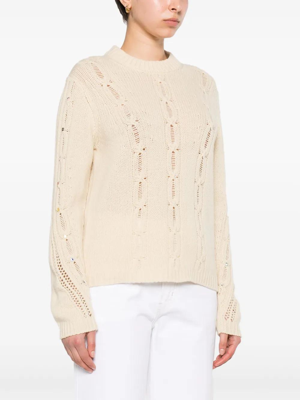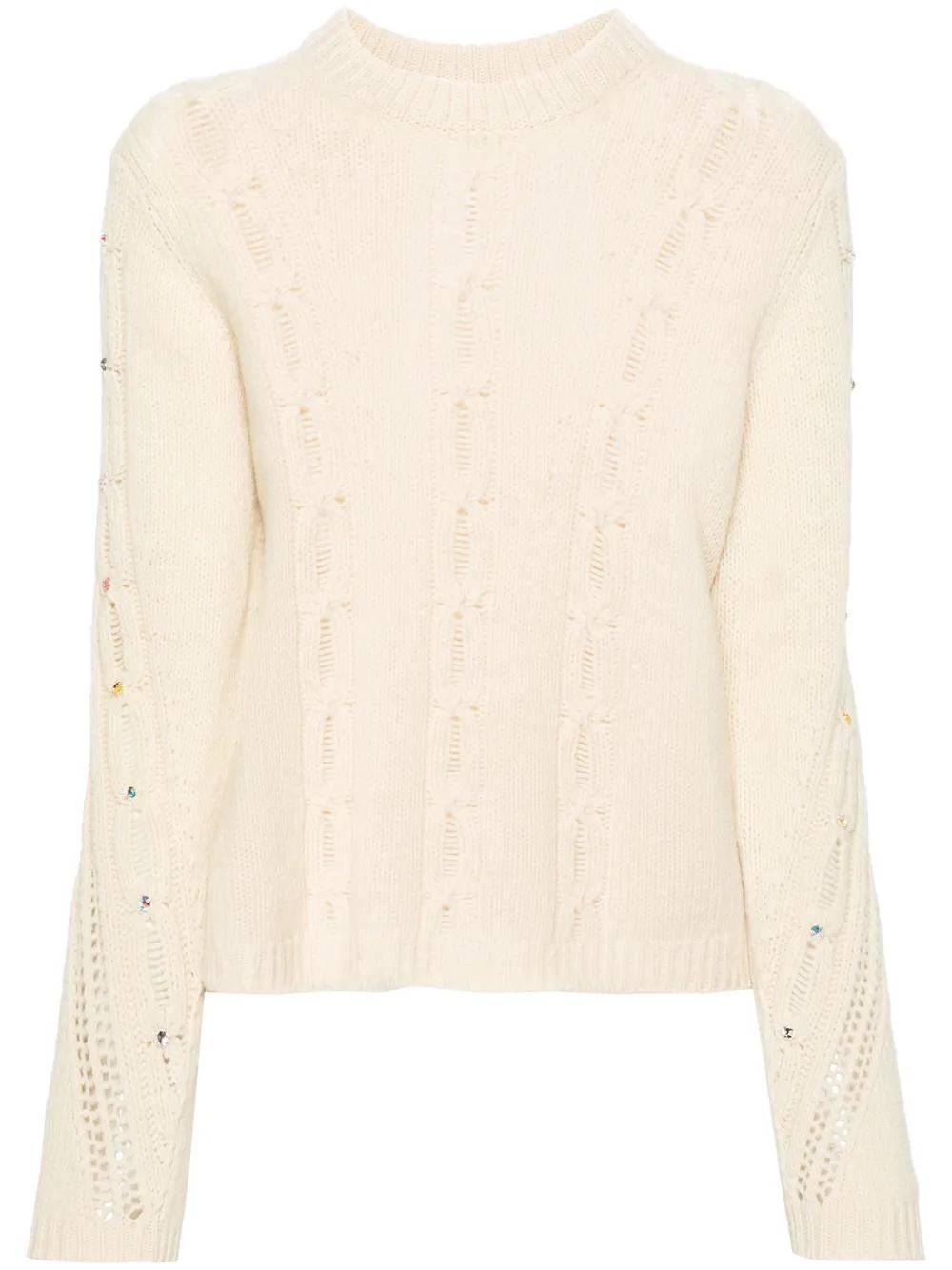 vanilla white merino wool knitted construction cable knit rhinestone embellishment crew neck long sleeves ribbed cuffs and hem