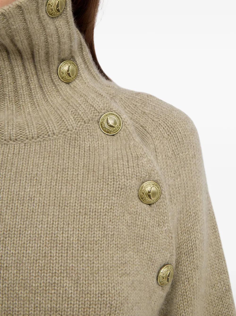 beige roll neck button embellishment ribbed hem and cuffs knitted construction