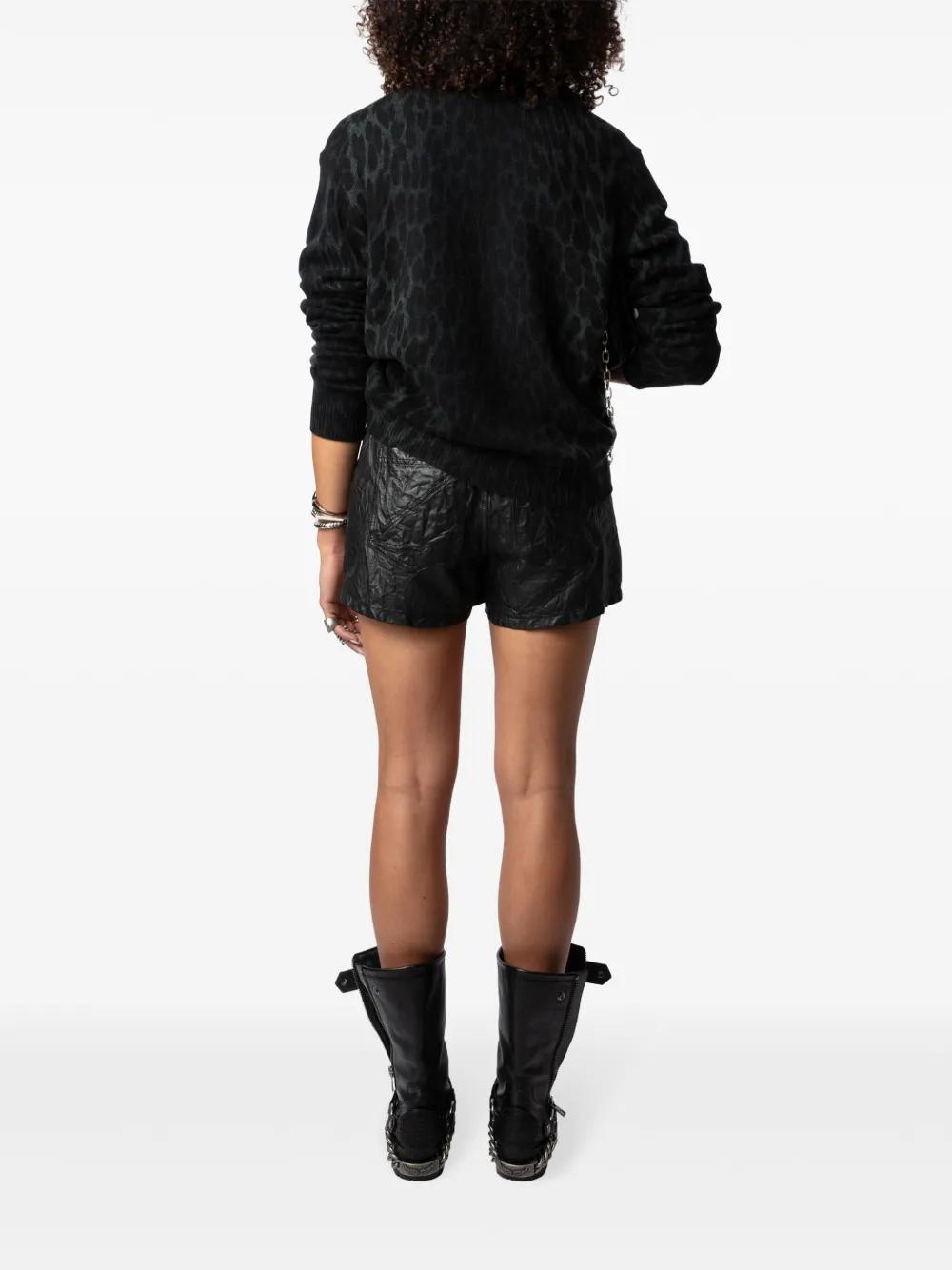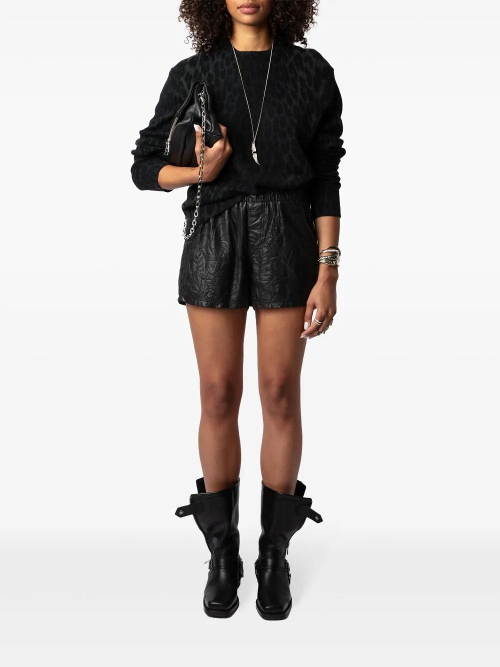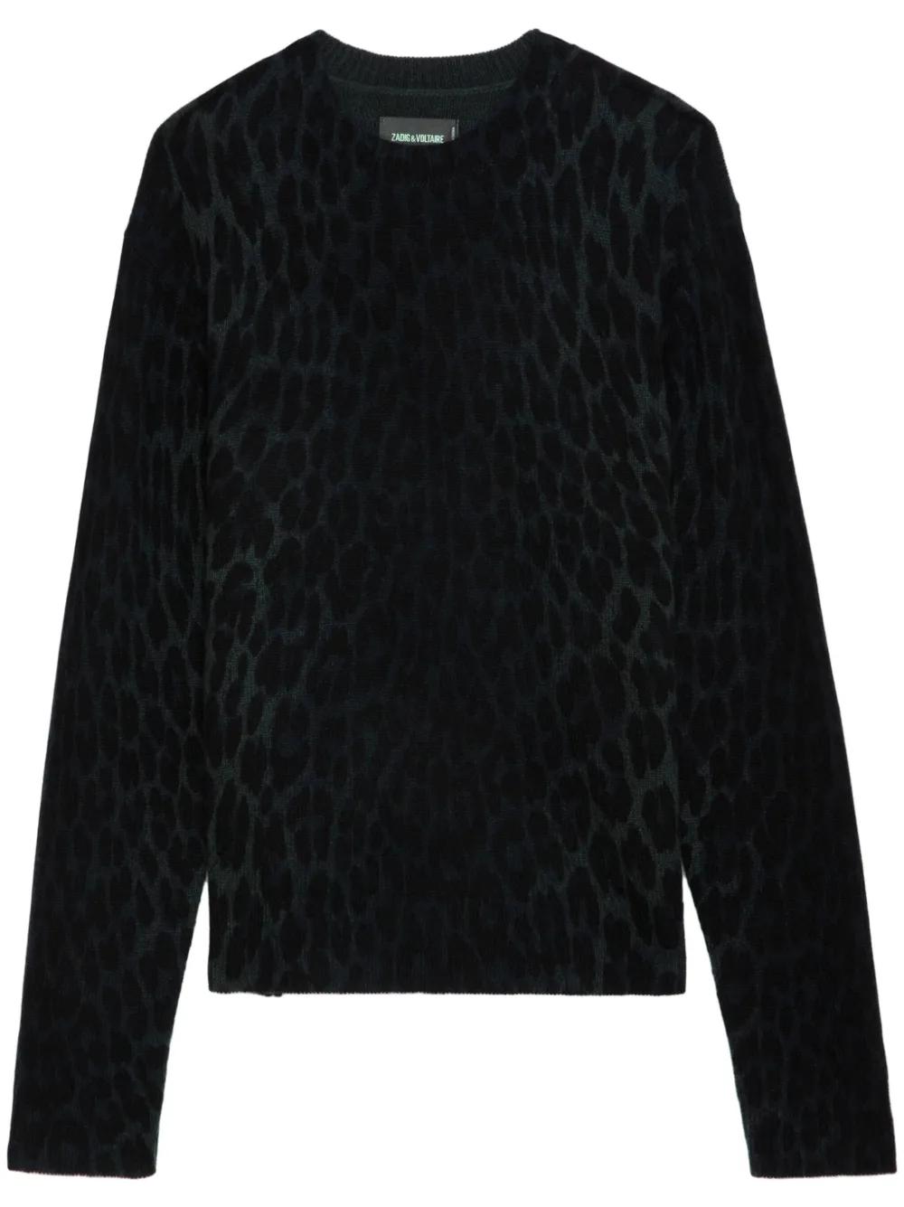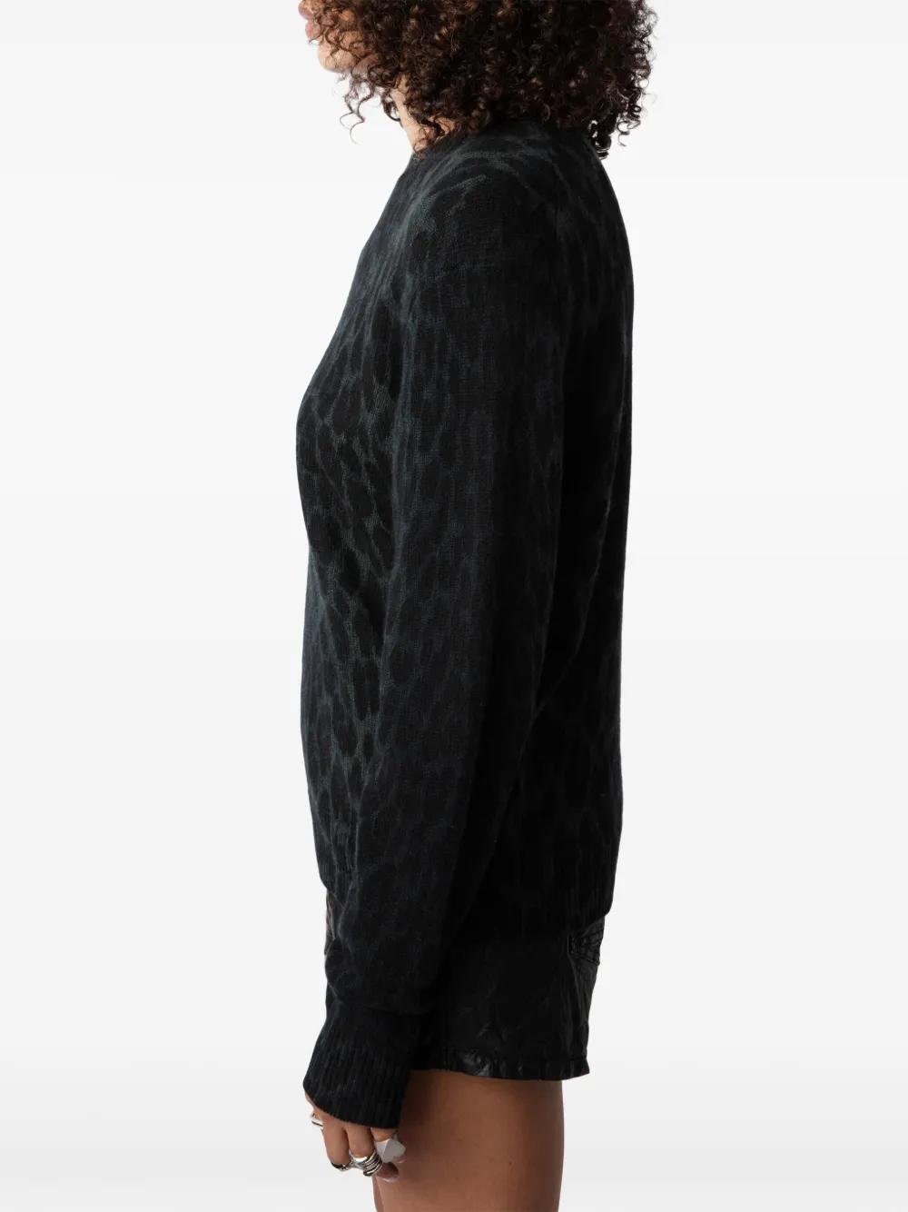 black cashmere fine knit leopard print round neck long sleeves straight hem
