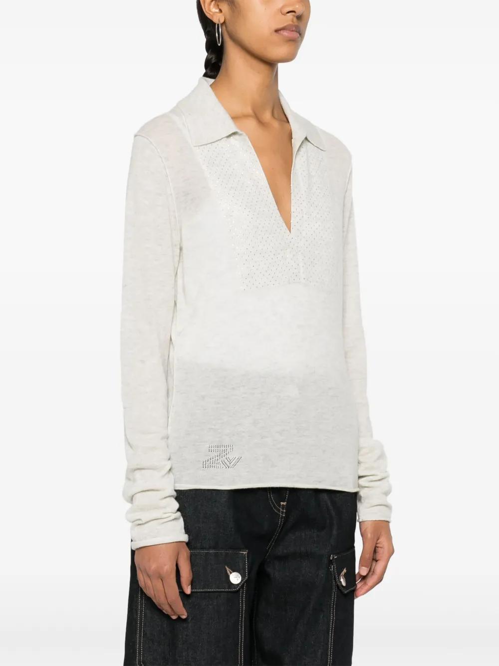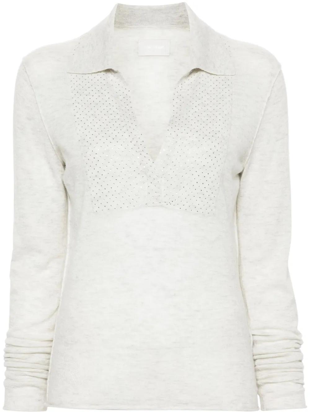 light beige cashmere fine knit mélange effect inside-out effect seams rhinestone-embellished front panel polo collar with split neck long sleeves straight hem