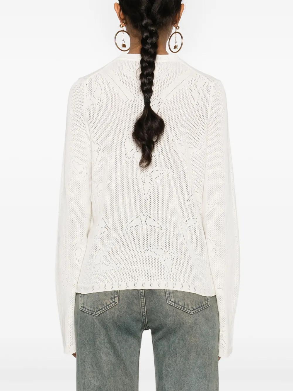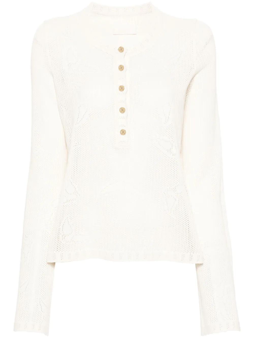 ecru cotton open knit all-over logo motif scallop round neck long sleeves short side slits straight hem unlined logo-embossed gold-tone buttons short front button fastening