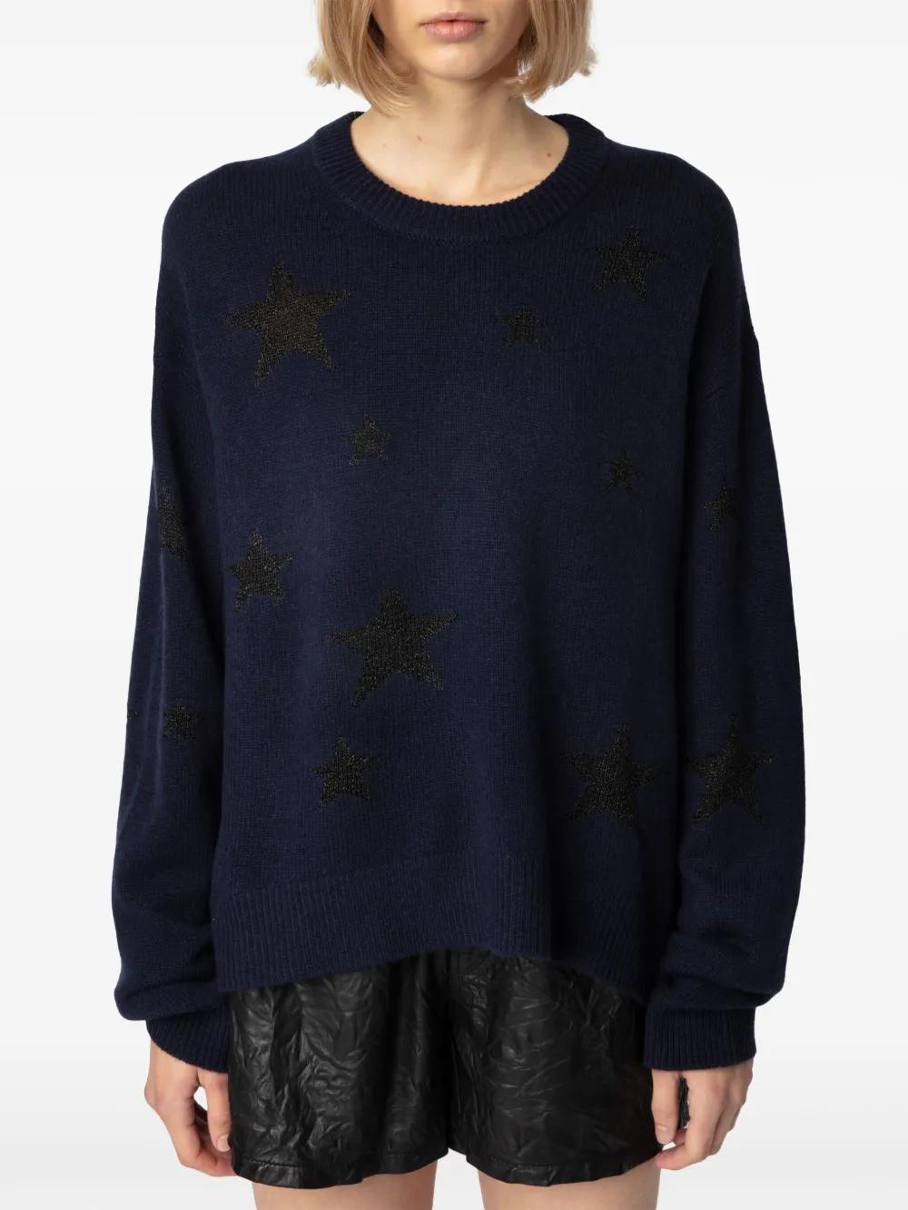 navy blue cashmere blend knitted construction sequin embellishment crew neck long sleeves ribbed cuffs and hem straight hem