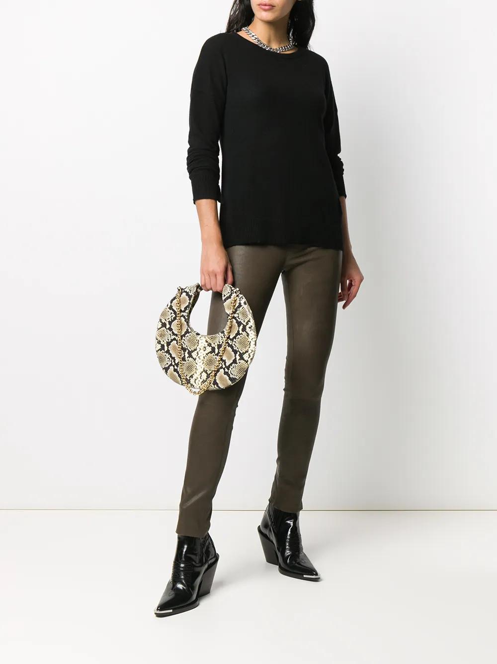 black cashmere fine knit round neck long slit sleeves star patch detail leather trim