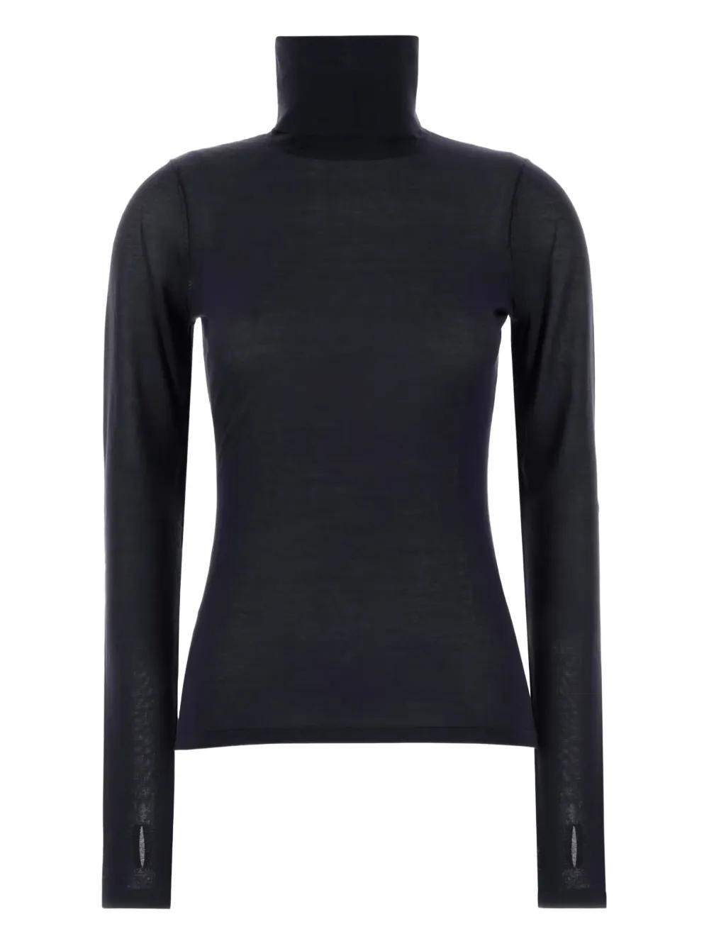 navy blue knit long sleeves thumb slots high neck
