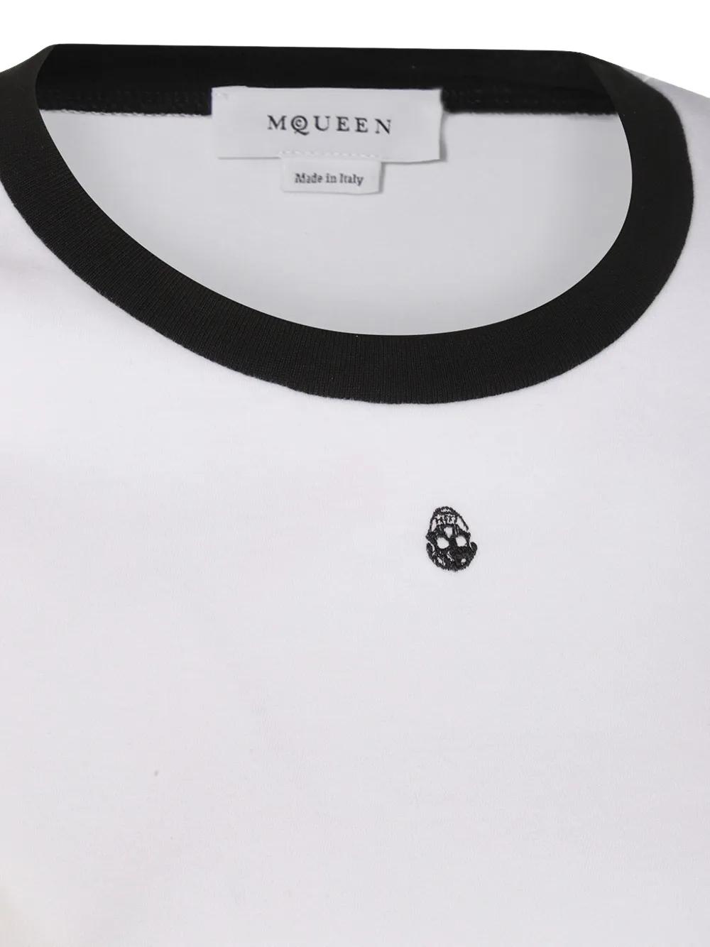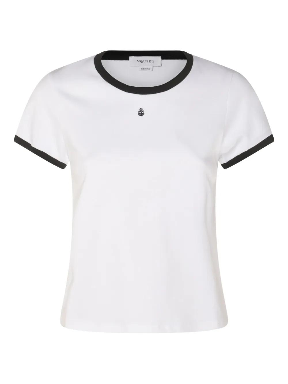 white contrast black neckline and sleeves embroidered logo detail short sleeves crew neck