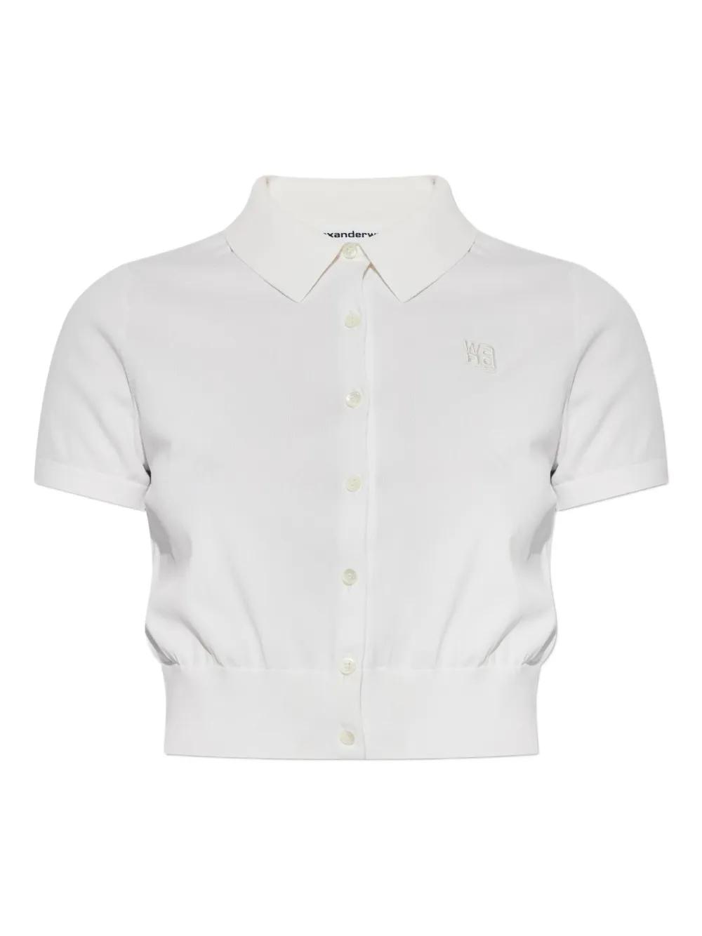 off-white short sleeves button front cropped length ribbed hem embroidered logo