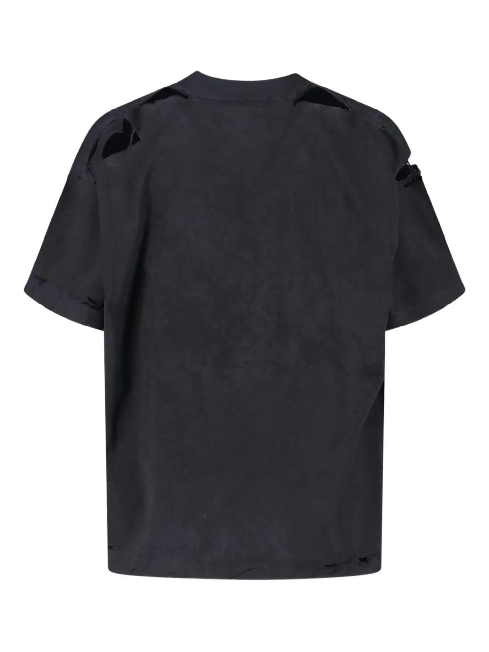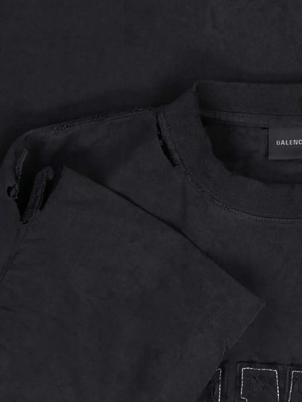 black distressed detailing short sleeves crew neck logo appliqué raw edges