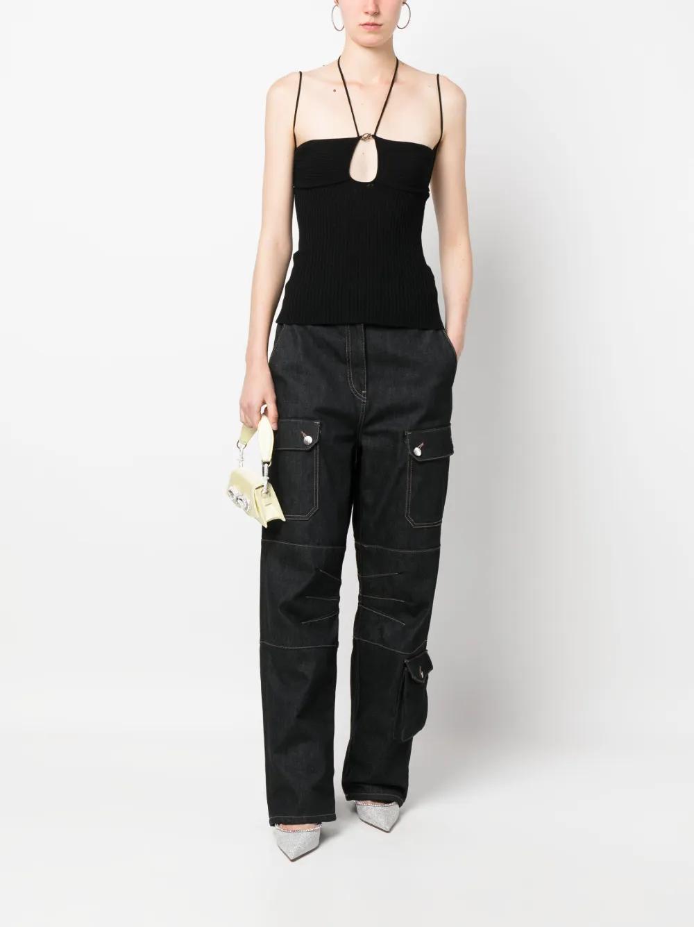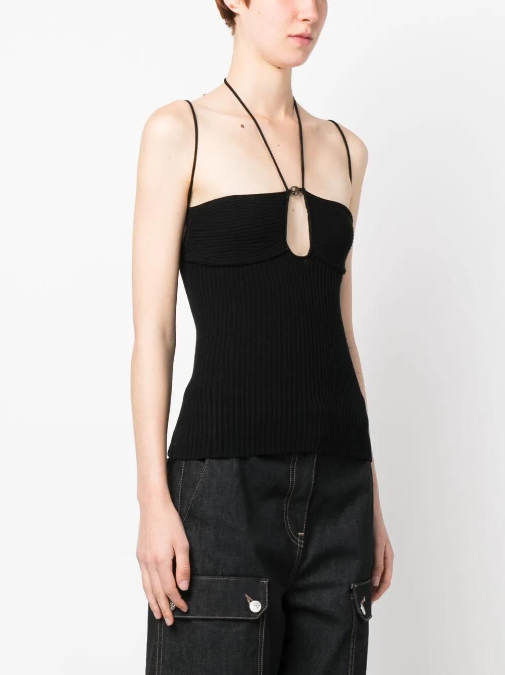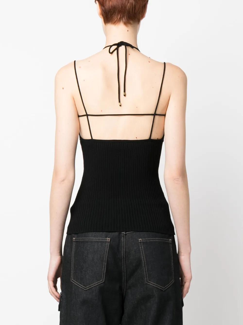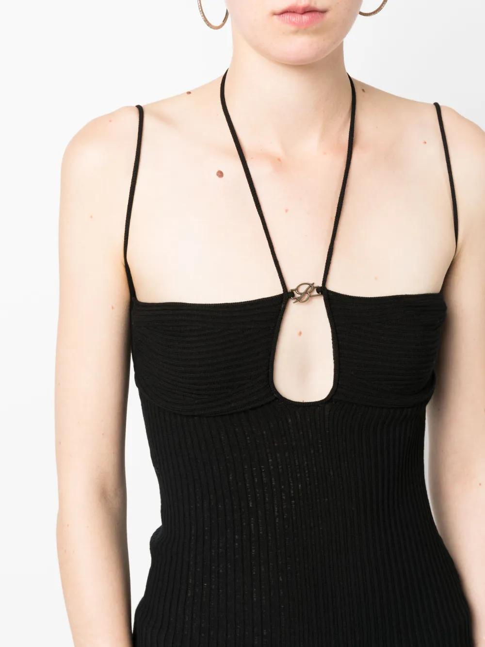 black ribbed knit cut-out detailing halterneck tie fastening spaghetti straps straight hem