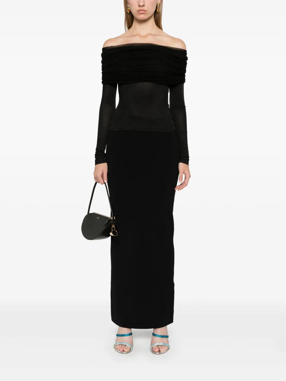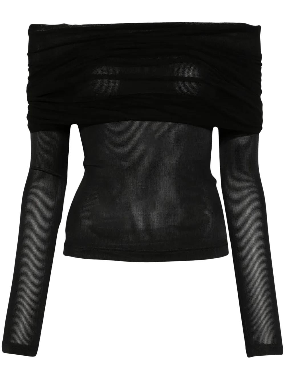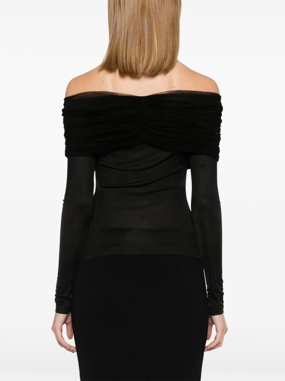 black stretch-jersey fine ribbed square neck off-shoulder long sleeves tulle panel ruched detailing straight hem