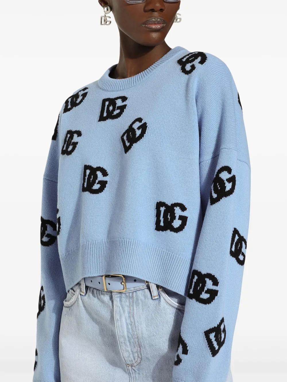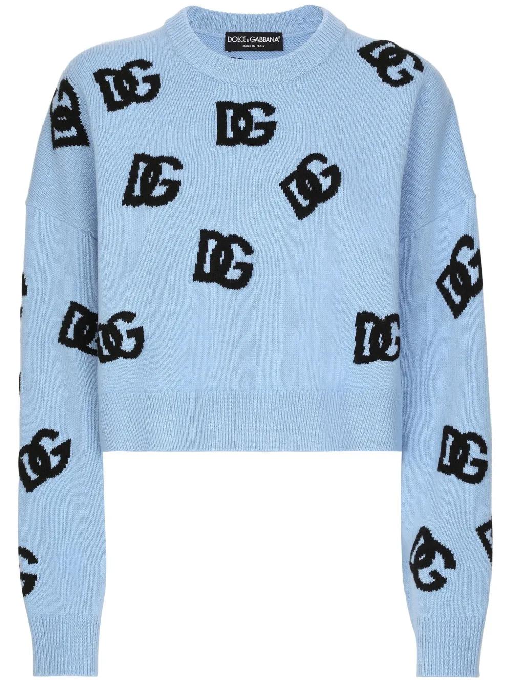 light blue virgin wool crew neck all-over logo embroidery ribbed cuffs and hem long sleeves