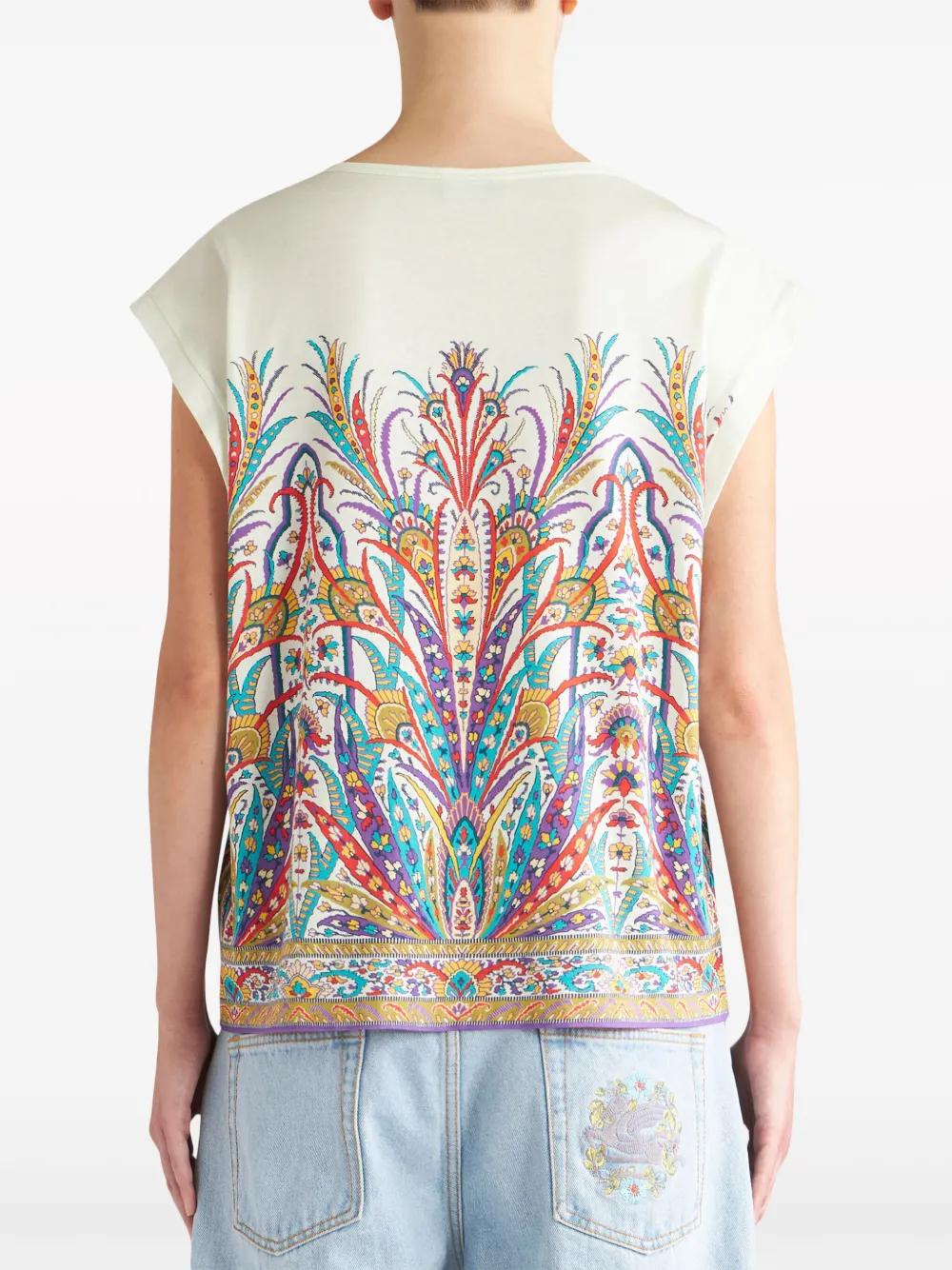 white/multicolour cotton jersey texture all-over graphic print Henley neck cap sleeves straight hem