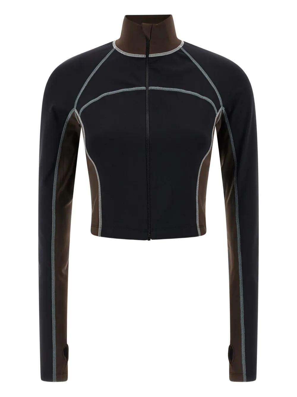 black brown panel contrast stitching high neck zip fastening logo print long sleeves