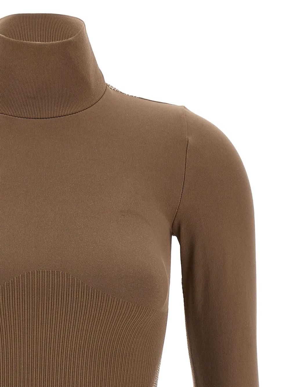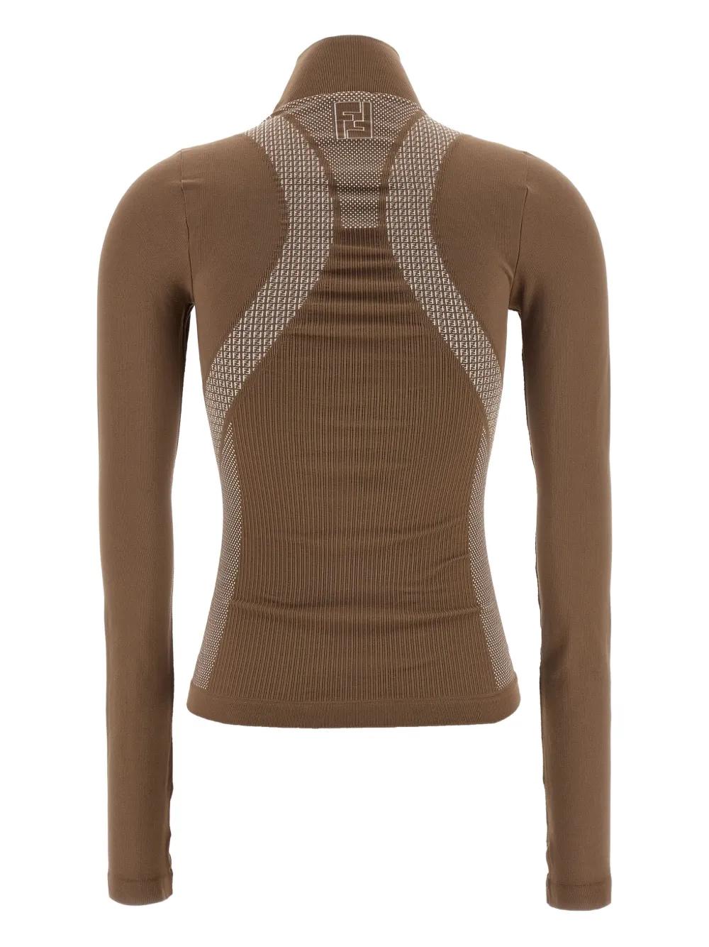 brown micro polka dot pattern ribbed inserts back logo detail high neck long sleeves