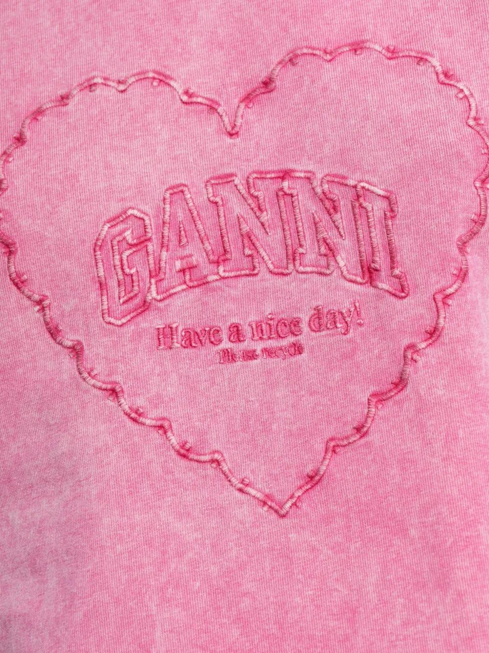 pink acid wash effect embroidered heart logo short sleeves crew neck cotton fabric