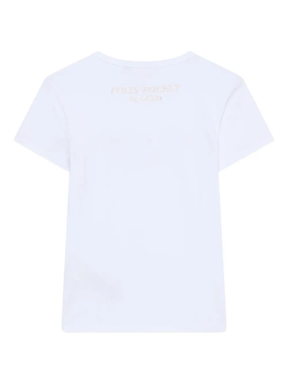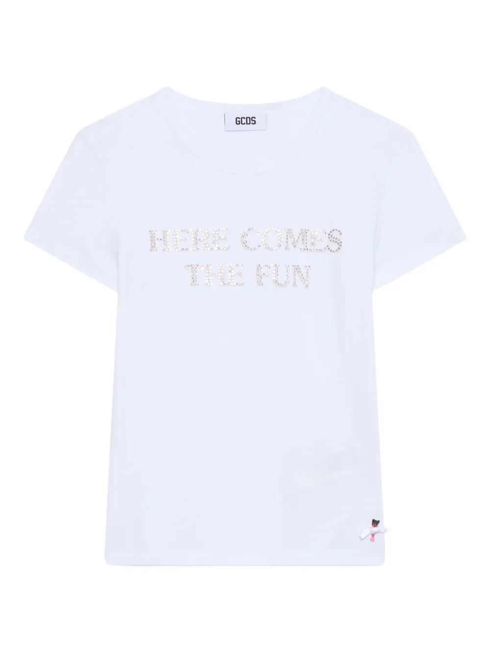 white cotton jersey texture appliqué logo signature single-stitch logo crew neck short sleeves straight hem