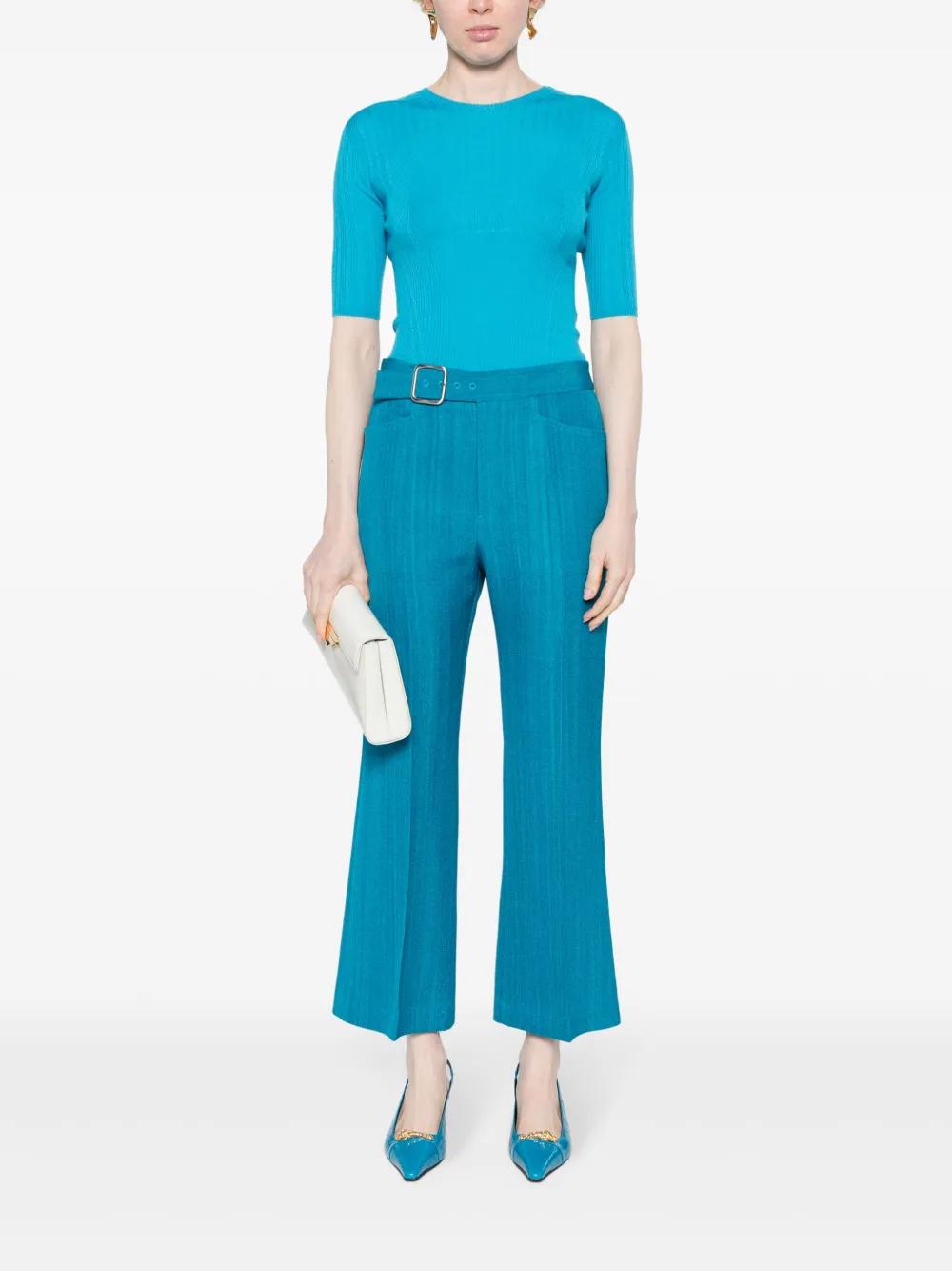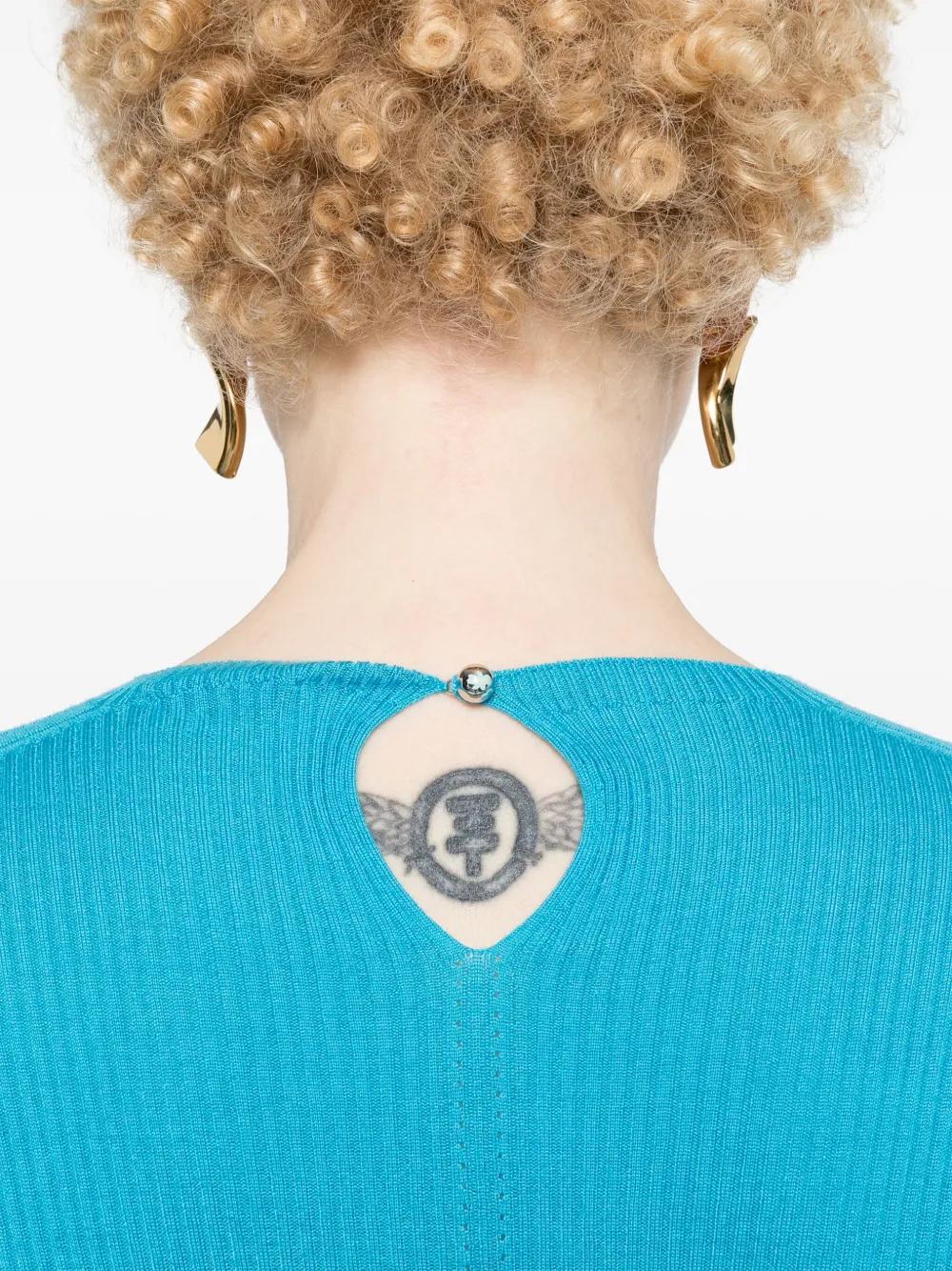 electric blue knitted construction panelled design pointelle knit panels ribbed knit panels round neck short sleeves straight hem keyhole detail to the rear single rear button fastening