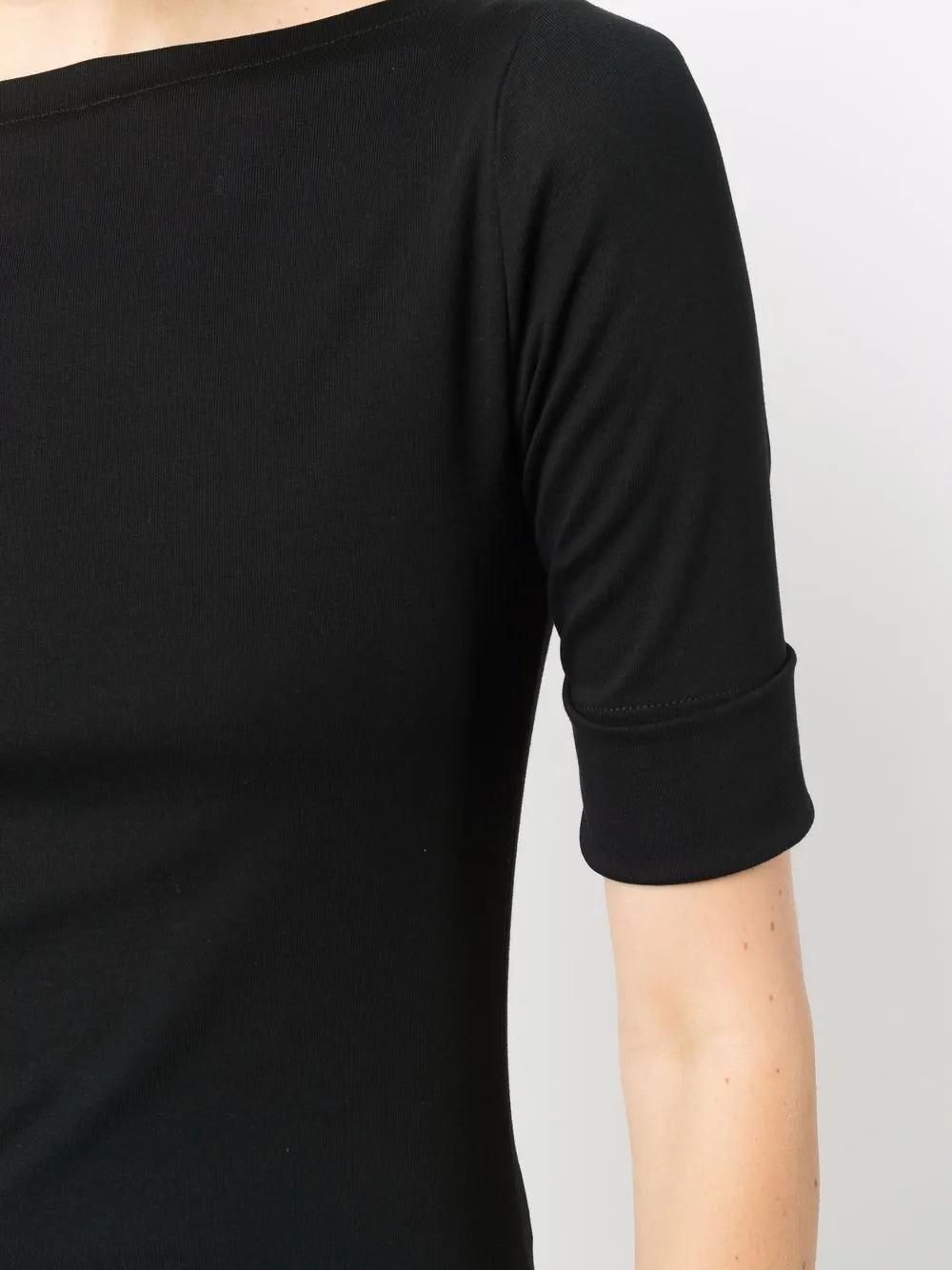 black cotton-blend stretch-design boat neck short sleeves turn-up cuffs