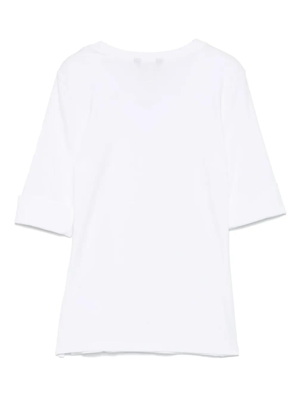 ivory white TENCEL™ Lyocell-organic cotton blend stretch-design draped detailing off-shoulder long sleeves straight hem