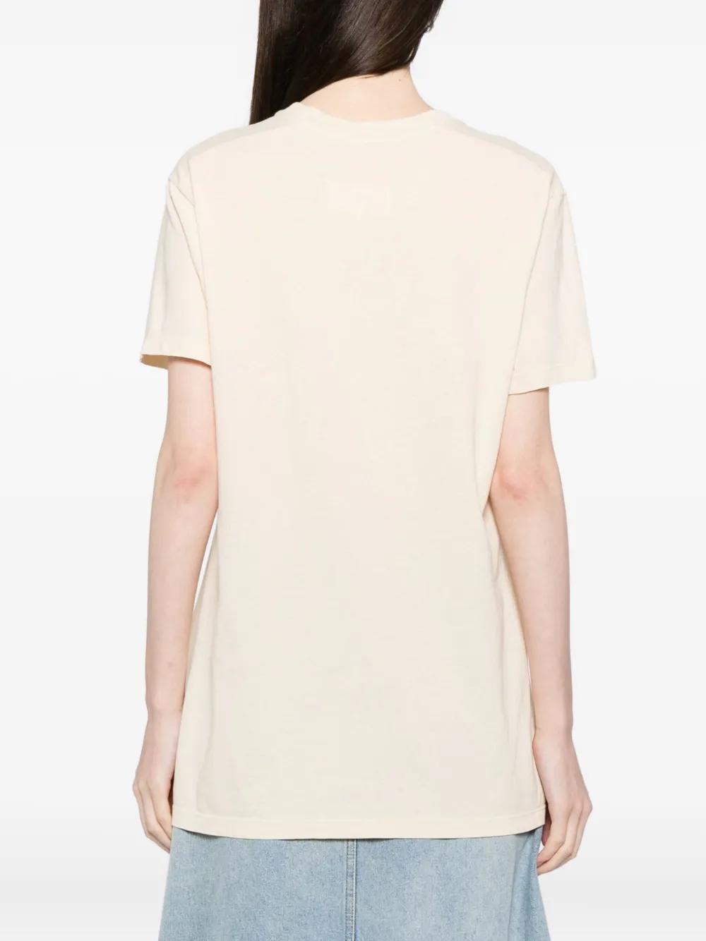 taupe crew neck logo print at the chest signature single-stitch design to the rear