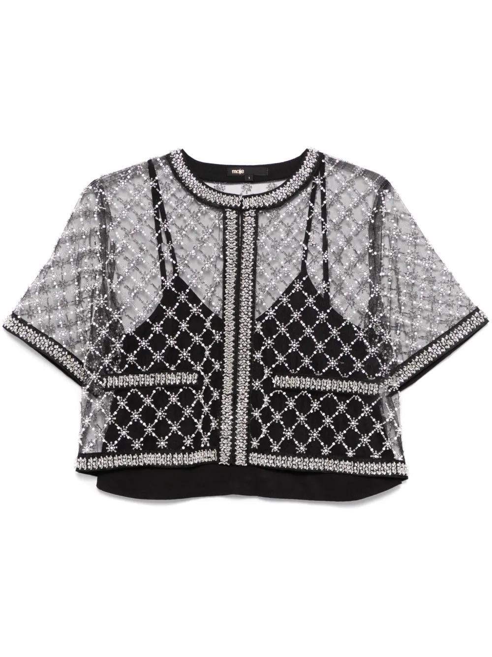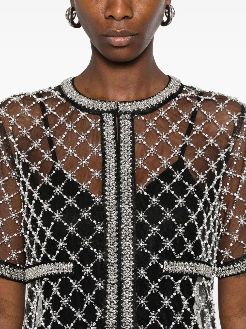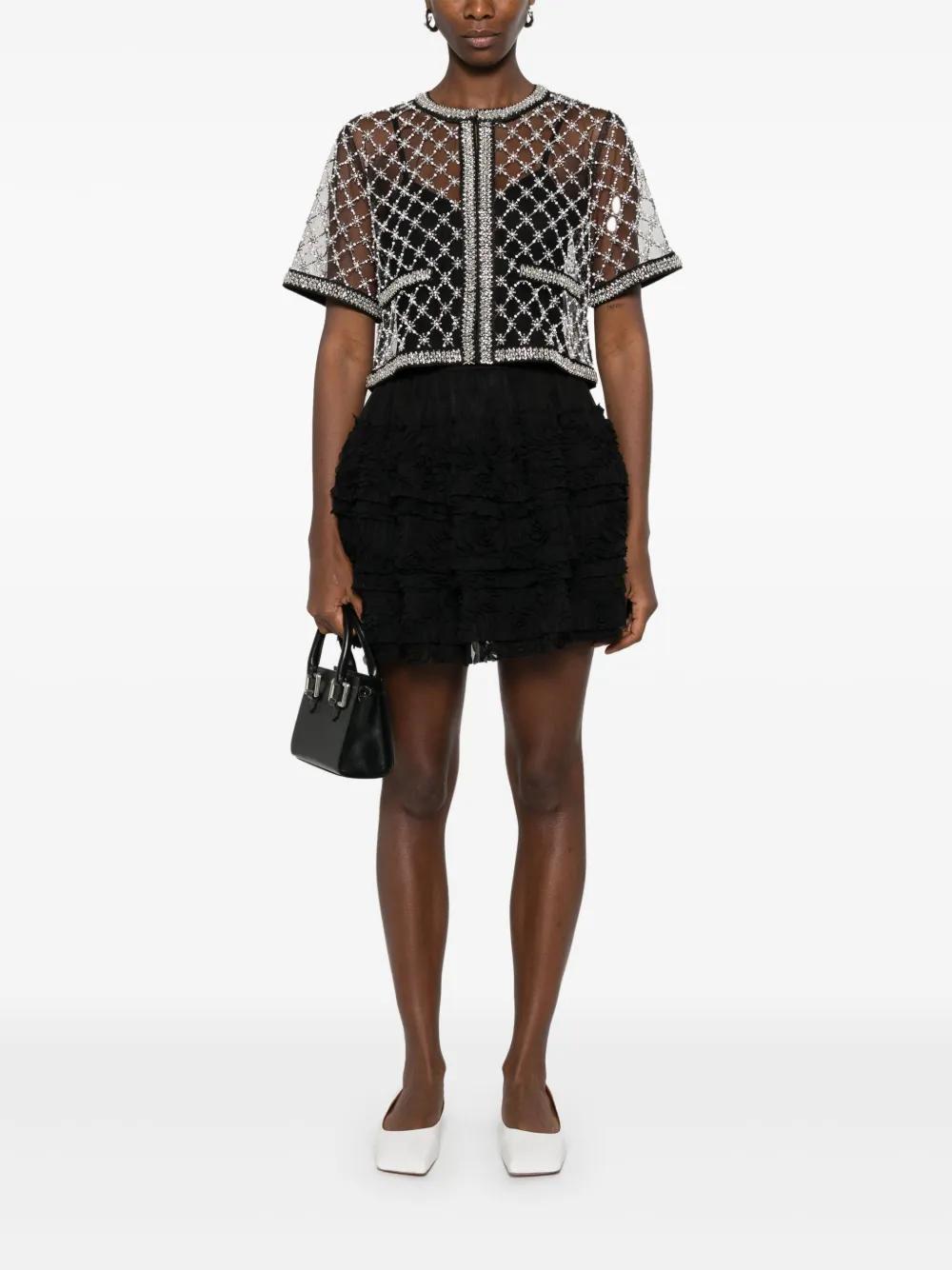 black tulle overlay semi-sheer construction bead embellishment crew neck short sleeves hook and eye fastening removable lining straight hem