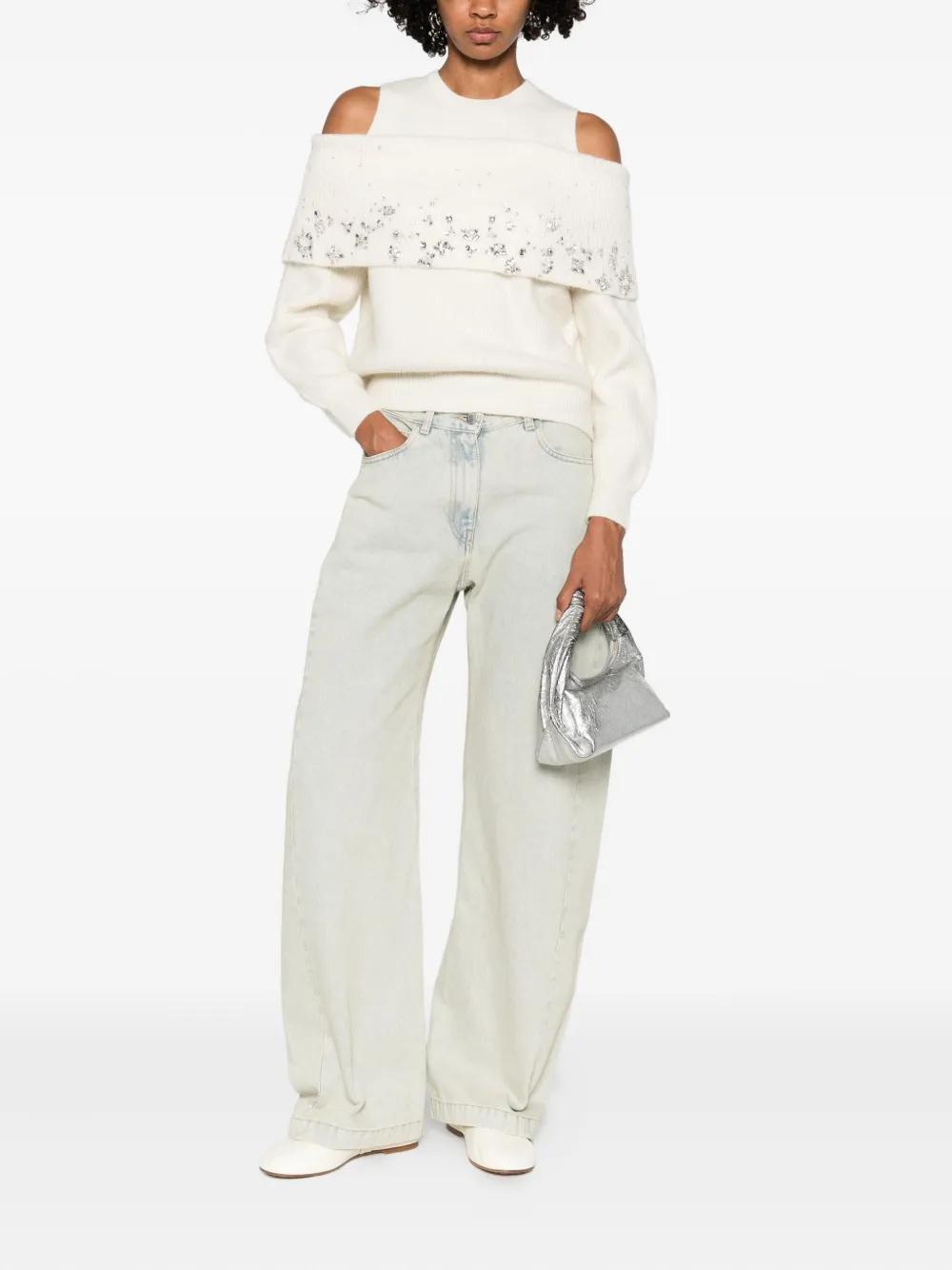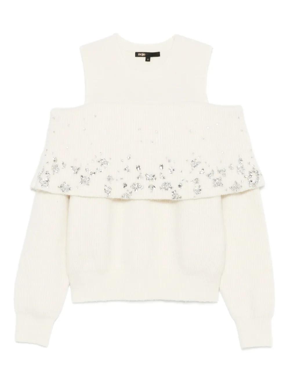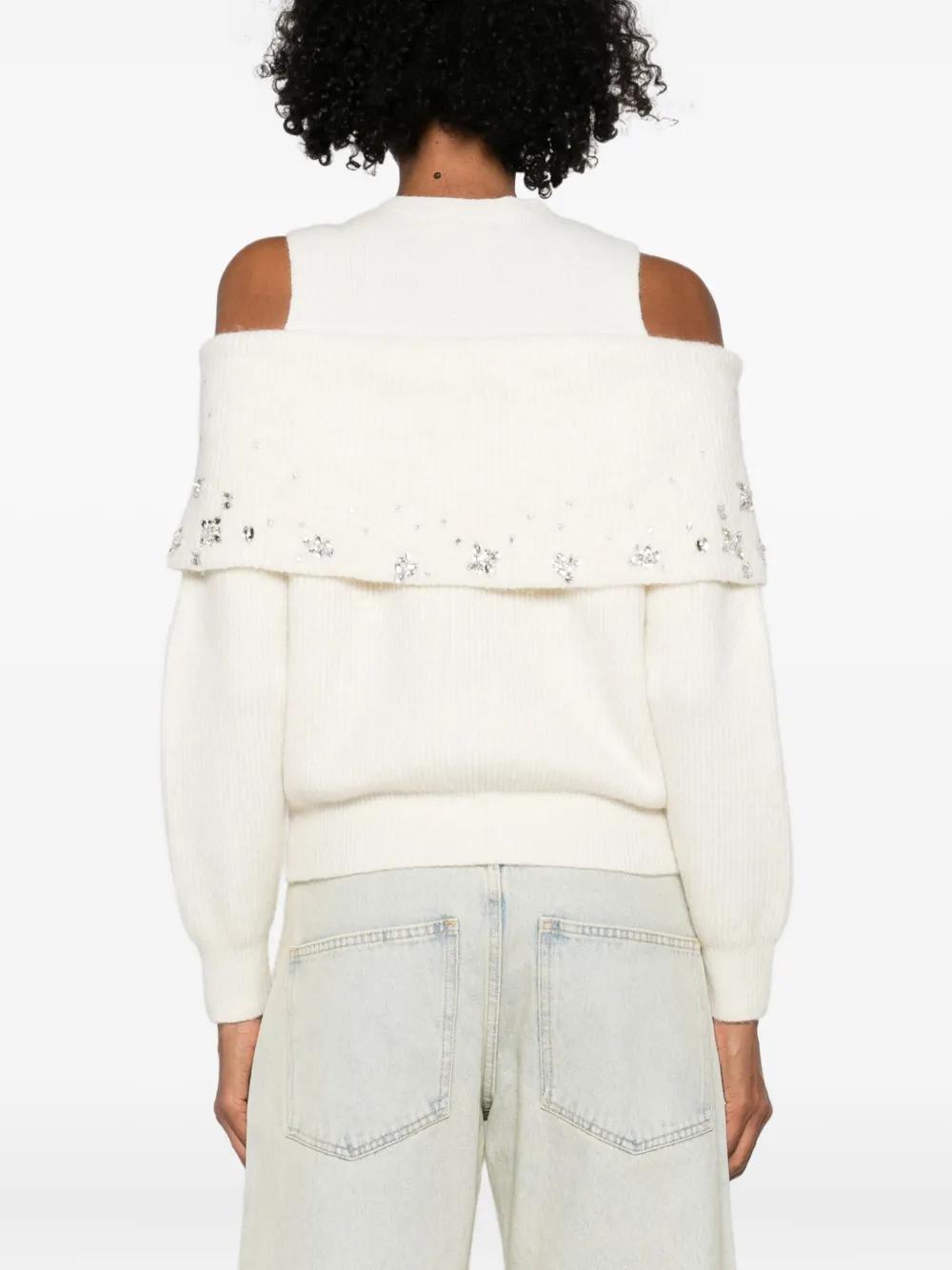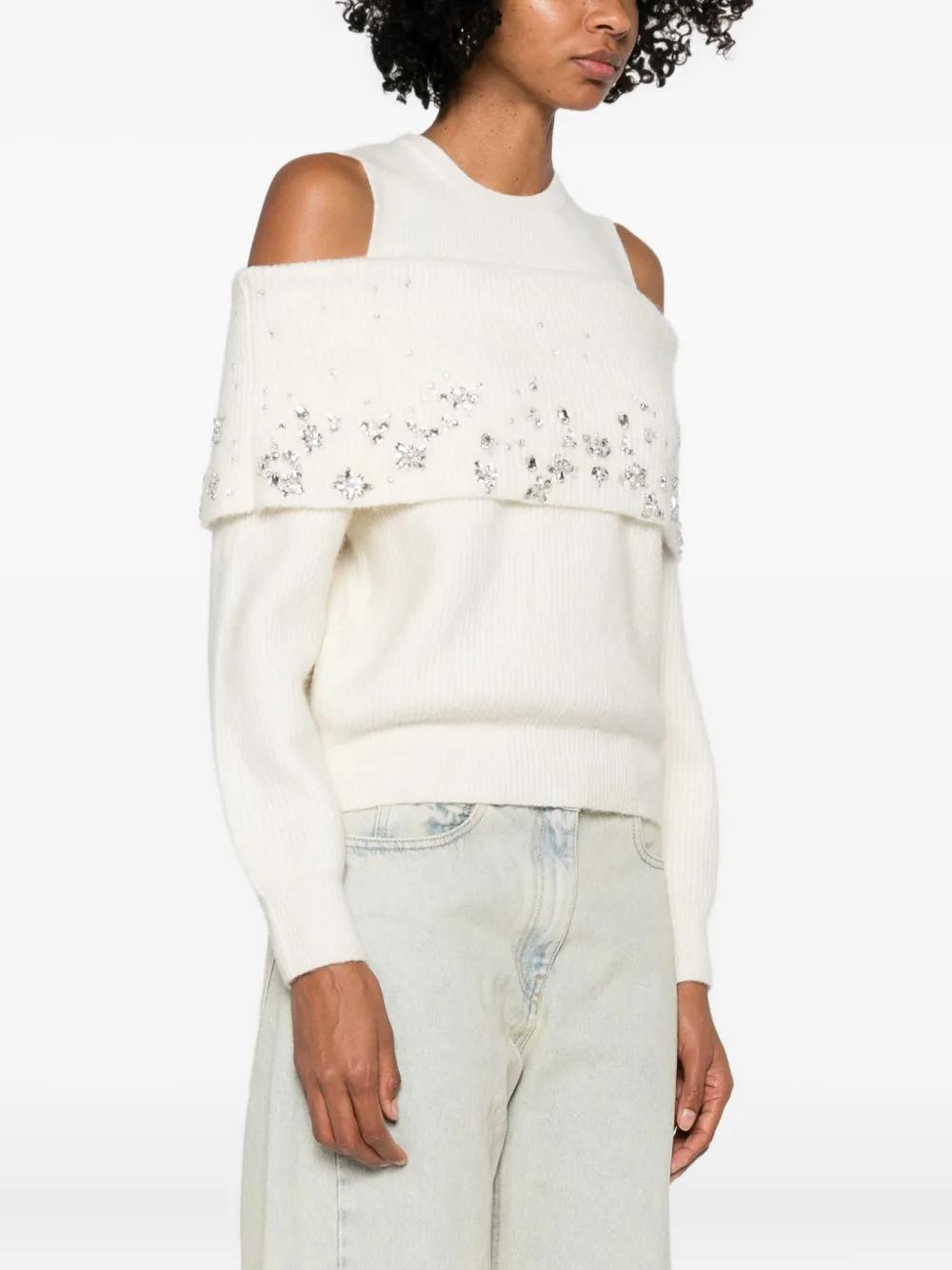 white rhinestone embellishment cold-shoulder style round neck long sleeves ribbed knit