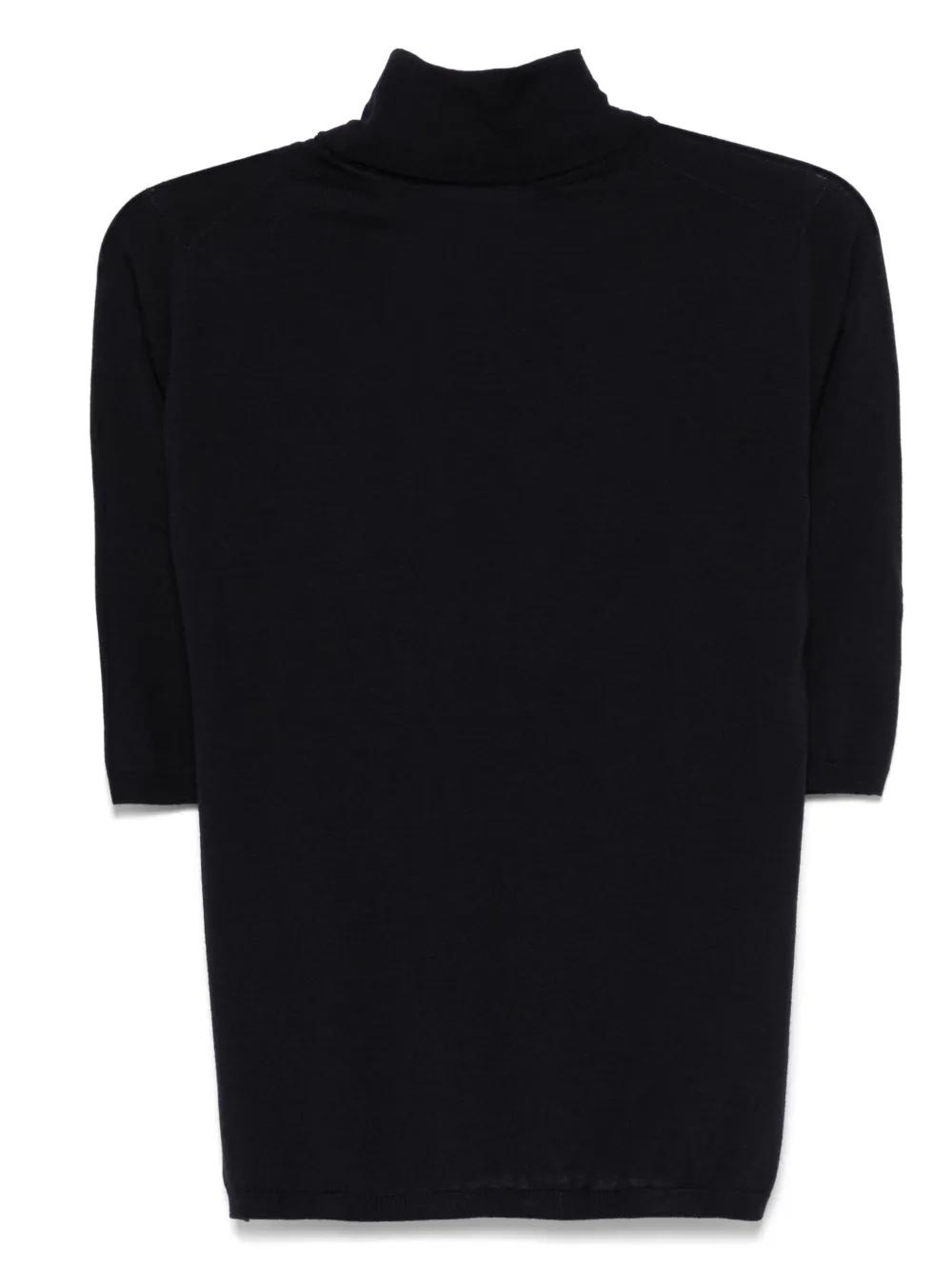 electric blue knitted construction panelled design pointelle knit panels ribbed knit panels round neck short sleeves straight hem keyhole detail to the rear single rear button fastening