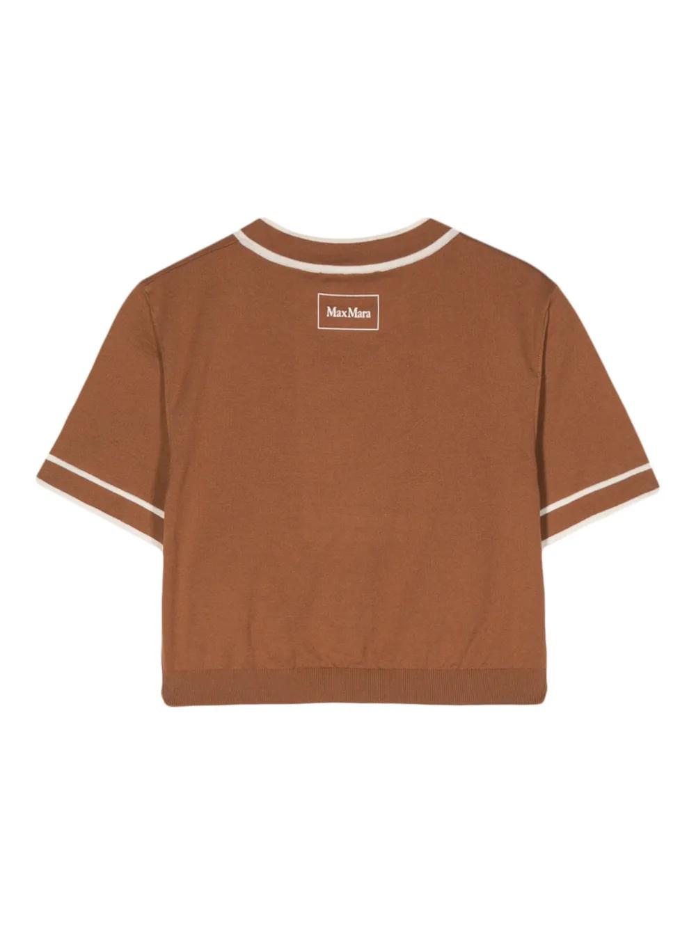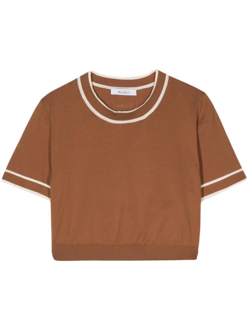 cognac brown cotton blend knitted construction fine knit round neck striped border short sleeves ribbed cuffs and hem logo print to the rear straight hem cropped