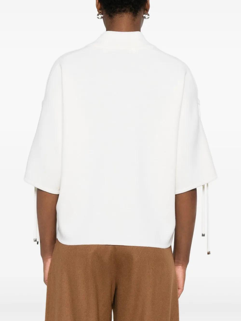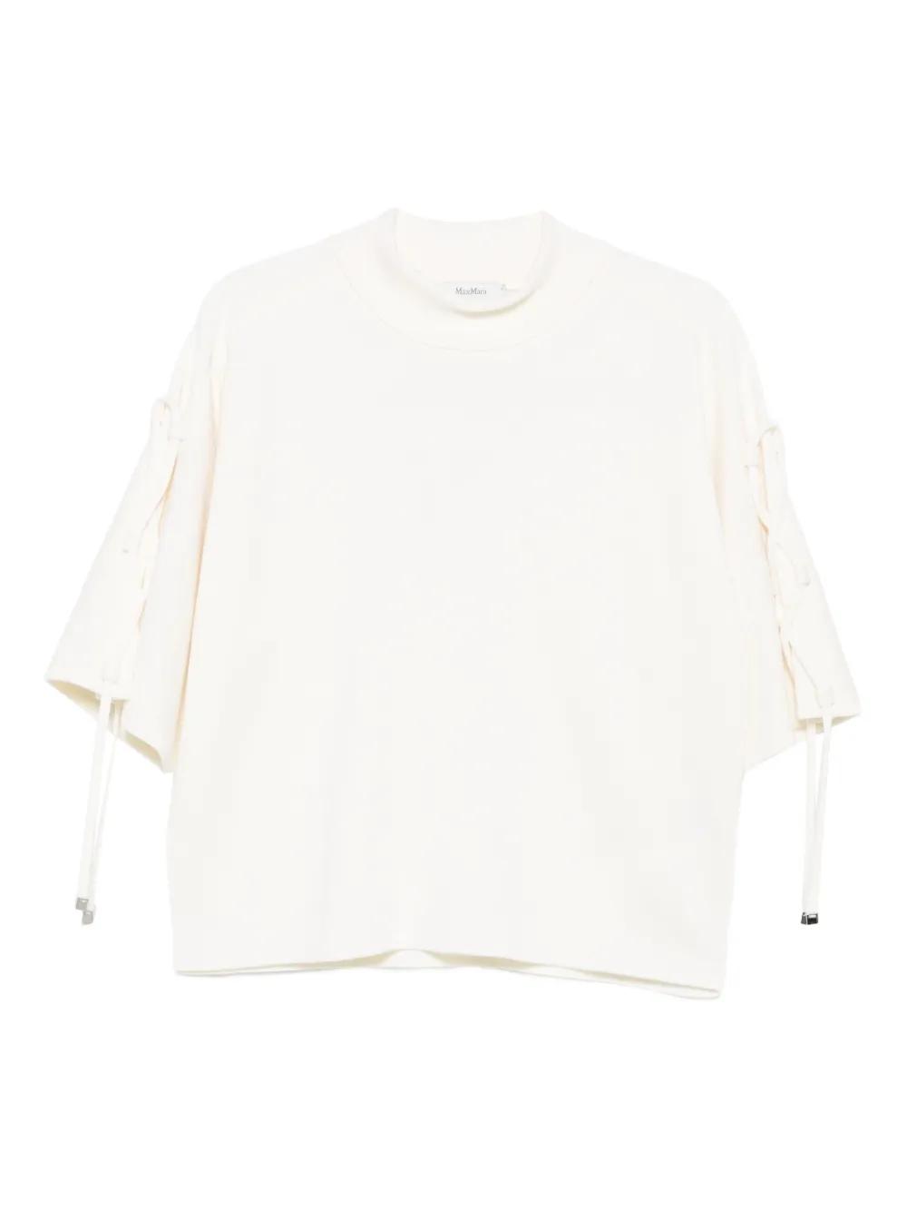 white lace-up detail at the sleeves mock neck short sleeves drop shoulder straight hem