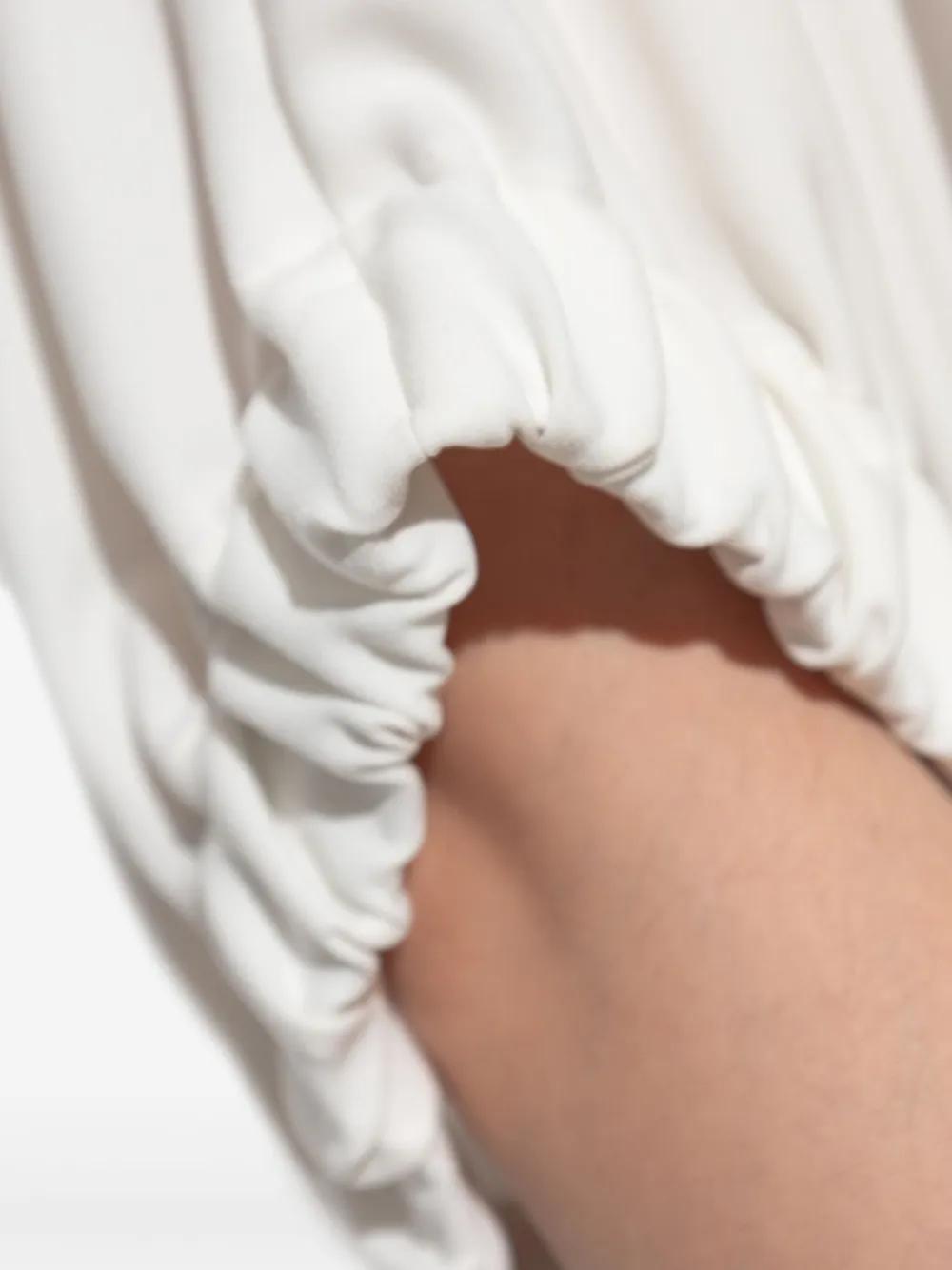 white round neckline gathered puff sleeves three quarter sleeve length