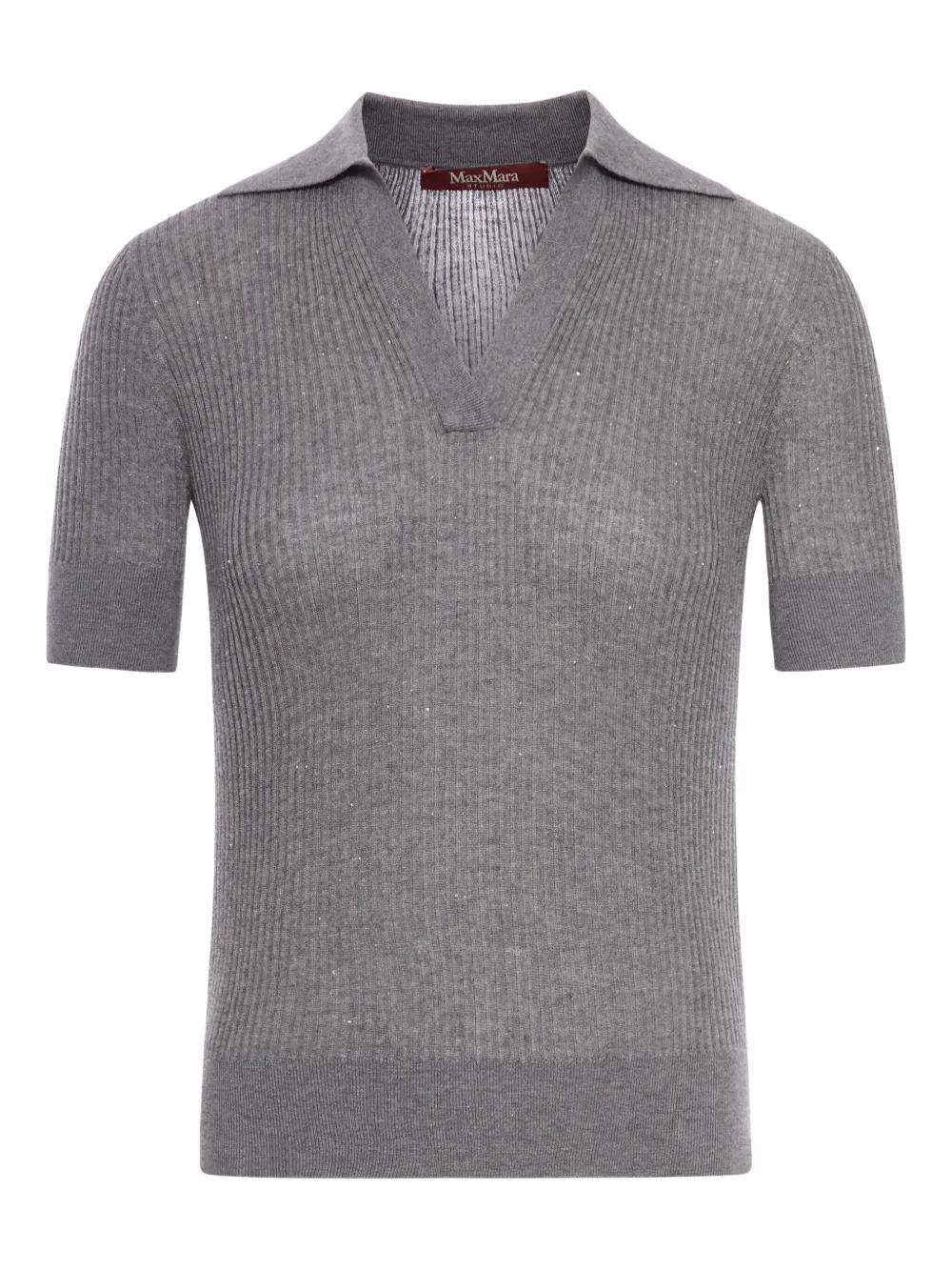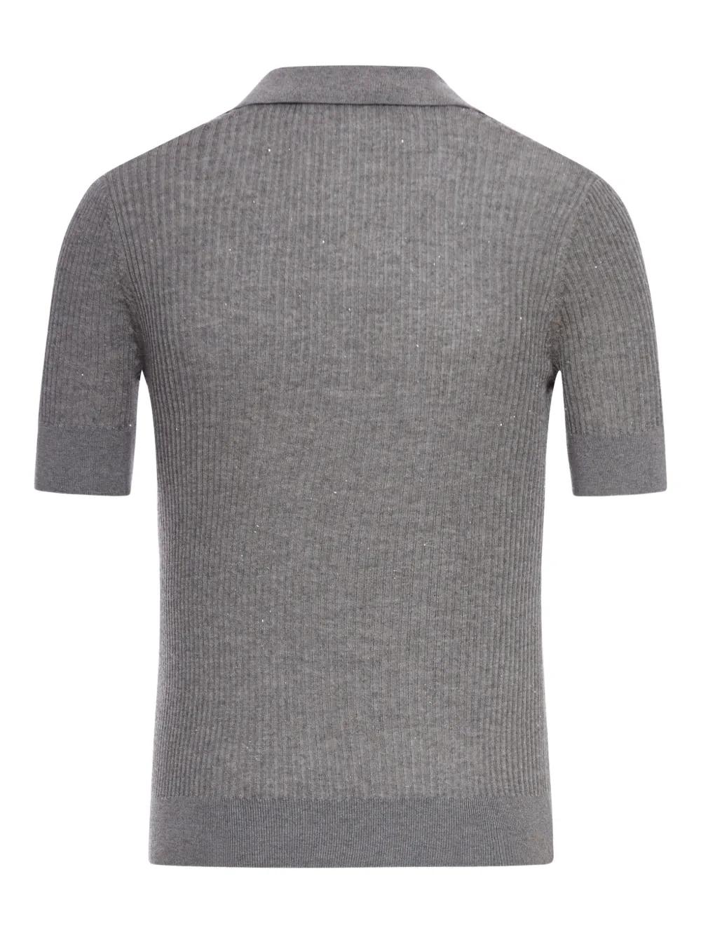 medium grey ribbed texture V-neck short sleeves ribbed hem sequin detailing