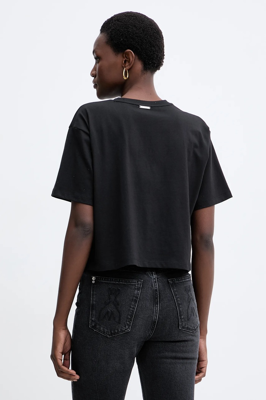 - Bawełna organiczna uprawiana jest bez użycia niebezpiecznych dla zdrowia substancji chemicznych, chemicznych środków szkodnikobójczych czy nawozów sztucznych. - Luźny krój zapewniający pełną swobodę ruchów. - Krótki rękaw. - Krój rękawa z obniżoną linią ramion nie ogranicza mobilności. - Klasyczny, okrągły dekolt. - Model z dżetami. - Długość: 49 cm. - Szerokość pod pachami: 52 cm. - Wymiary podane dla rozmiaru: S.