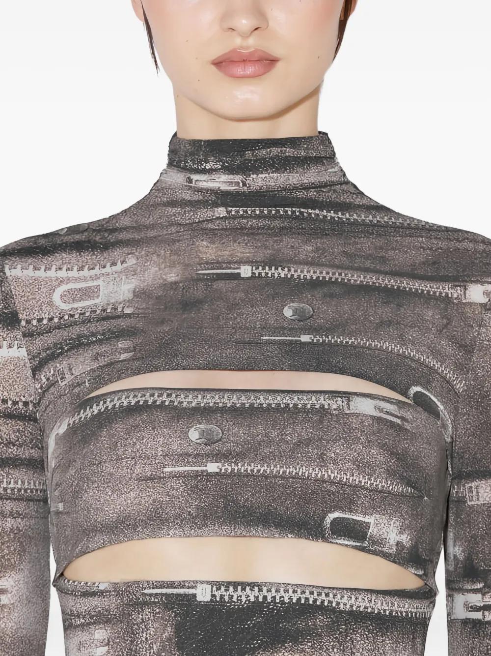 grey and multicolour zipper print turtleneck cutouts at front cutouts at back
