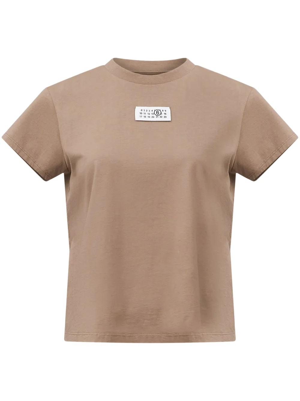 sand beige cotton jersey texture crew neck short sleeves logo patch to the front straight hem