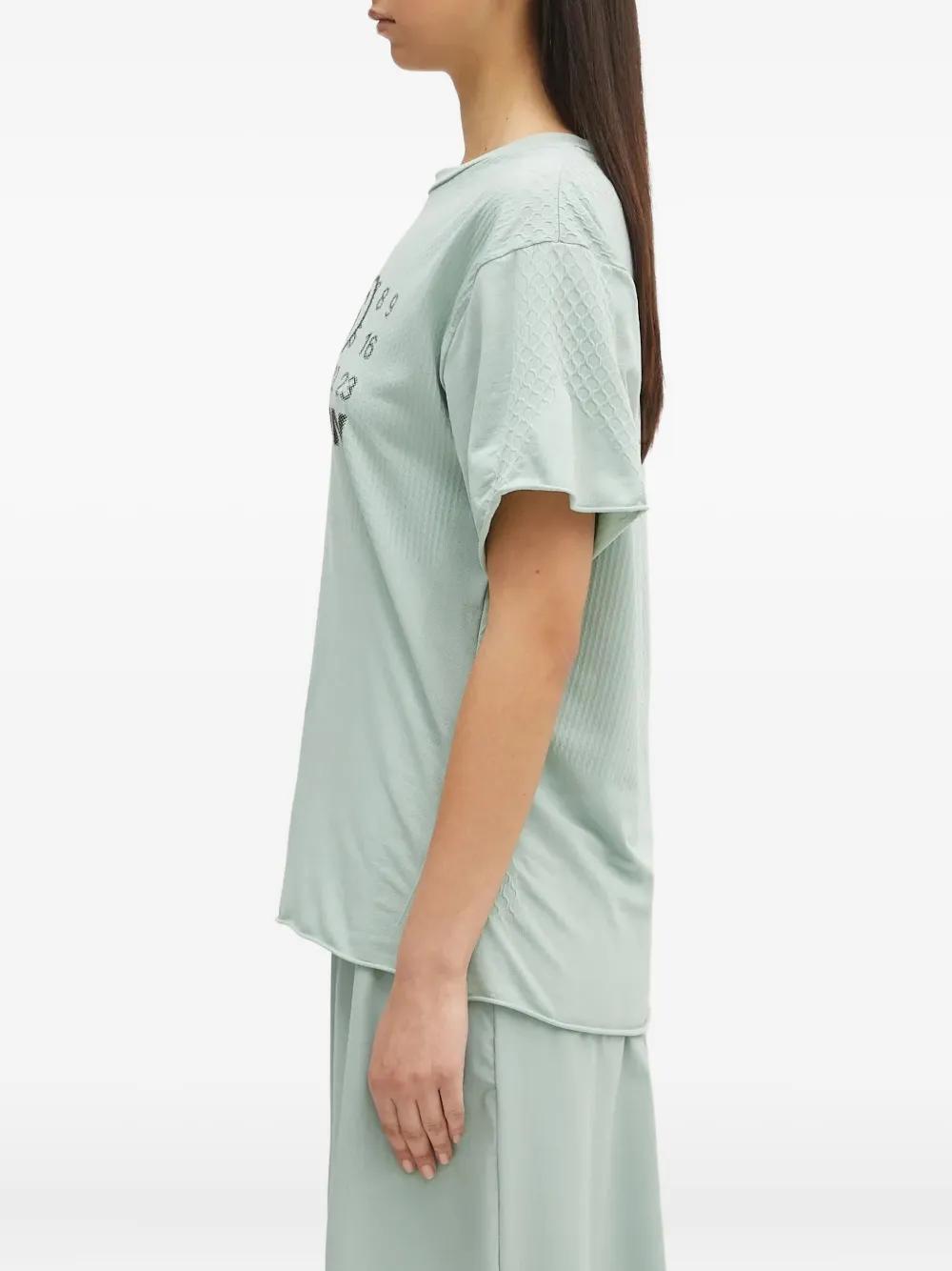 jade green Salomon-logo print textured fabric short sleeves round neck raw-edge hem
