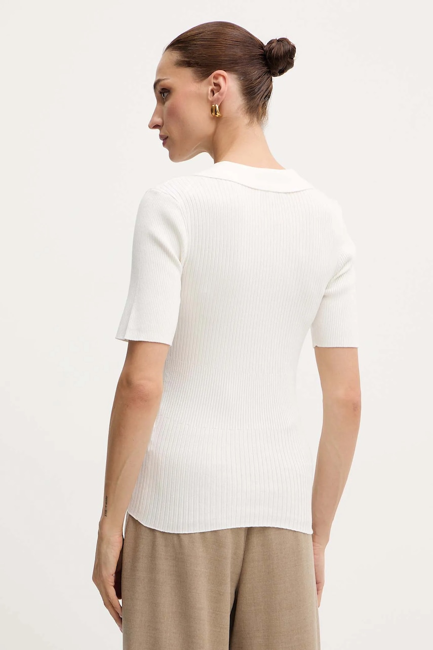 - Produkt częściowo wykonany z LENZING™ ECOVERO™ - materiału przyjaznego środowisku. Produkcja LENZING™ ECOVERO™ z ekologicznej celulozy i pulpy drzewnej wykorzystuje o 50% mniej wody w porównaniu do popularnej wiskozy. - Dopasowany fason. - Spiczasty dekolt z kołnierzykiem. - Ozdobne guziki. - Krótkie, dopasowane rękawy. - Długość: 58 cm. - Szerokość pod pachami: 38 cm. - Wymiary podane dla rozmiaru: S.