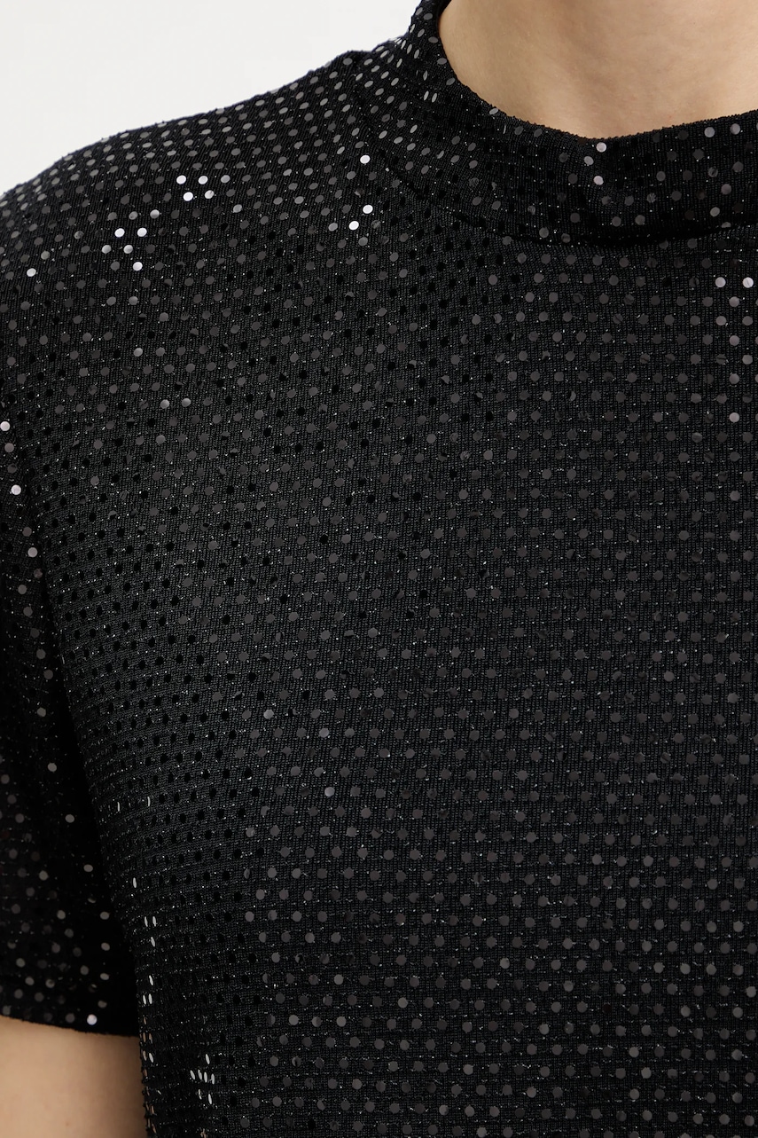 - Prosty, nie blokujący ruchów fason. - Klasyczny, okrągły dekolt. - Krótkie, proste rękawy. - Z tyłu zapięcie na guzik. - Dodatkowa warstwa materiału w postaci podszewki. - Długość: 47 cm. - Szerokość pod pachami: 46 cm. - Wymiary podane dla rozmiaru: S.