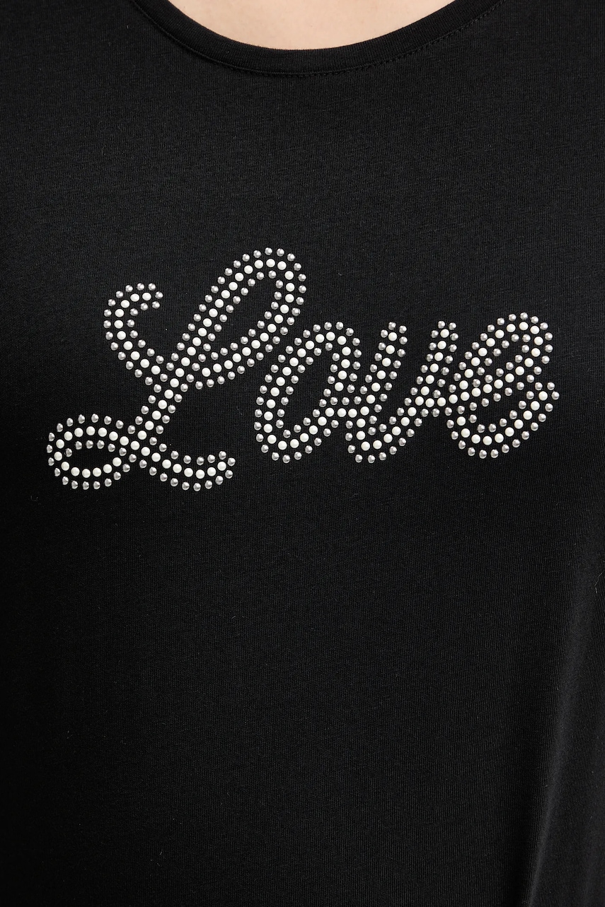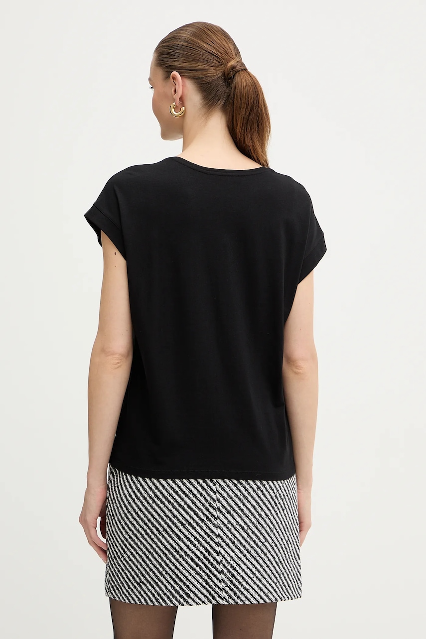- Prosty fason. - Klasyczny, okrągły dekolt. - Cienka, elastyczna dzianina. - Model z ozdobną aplikacją z dżetów. - Długość: 61 cm. - Szerokość pod pachami: 45 cm. - Wymiary podane dla rozmiaru: S.