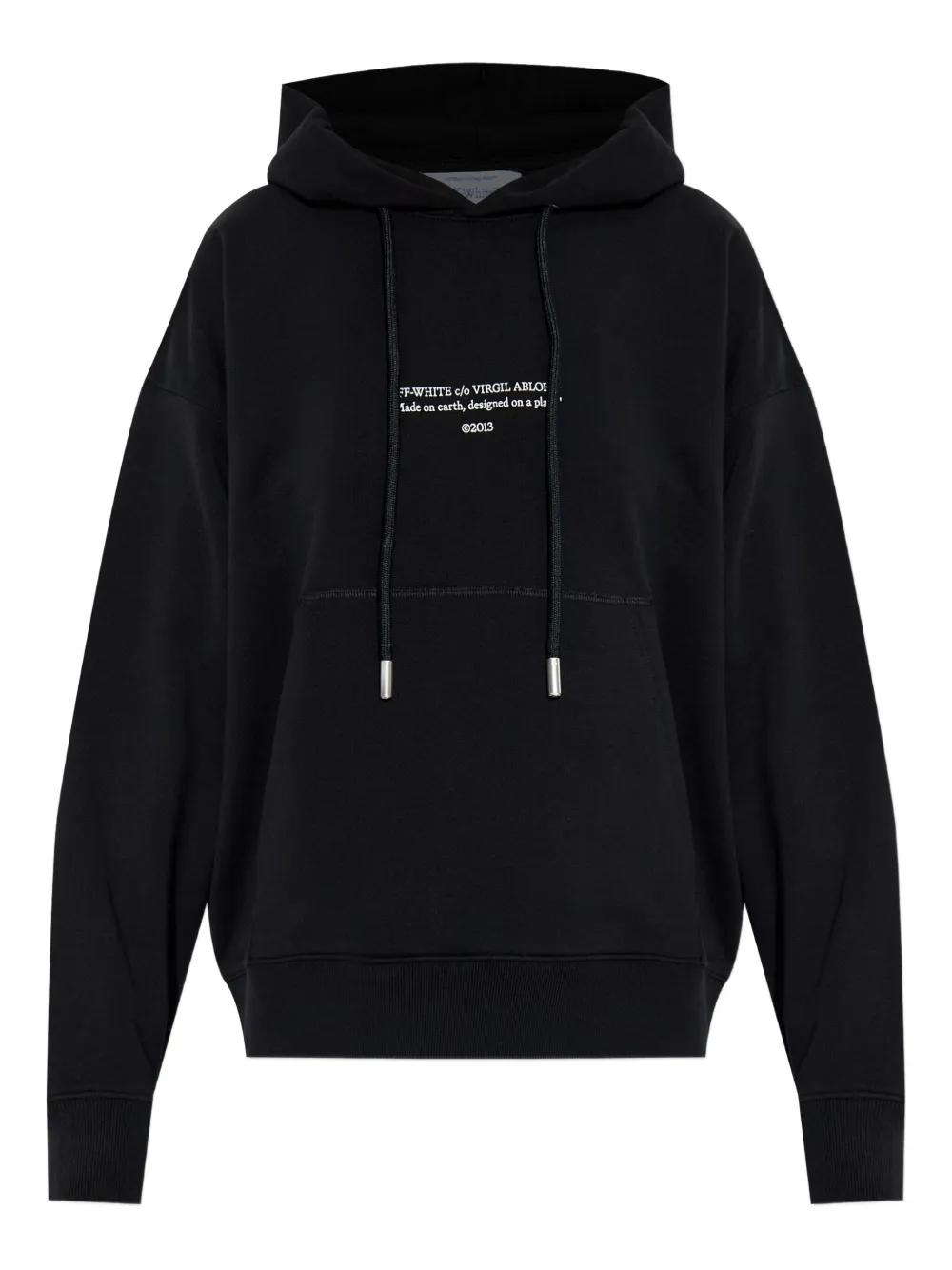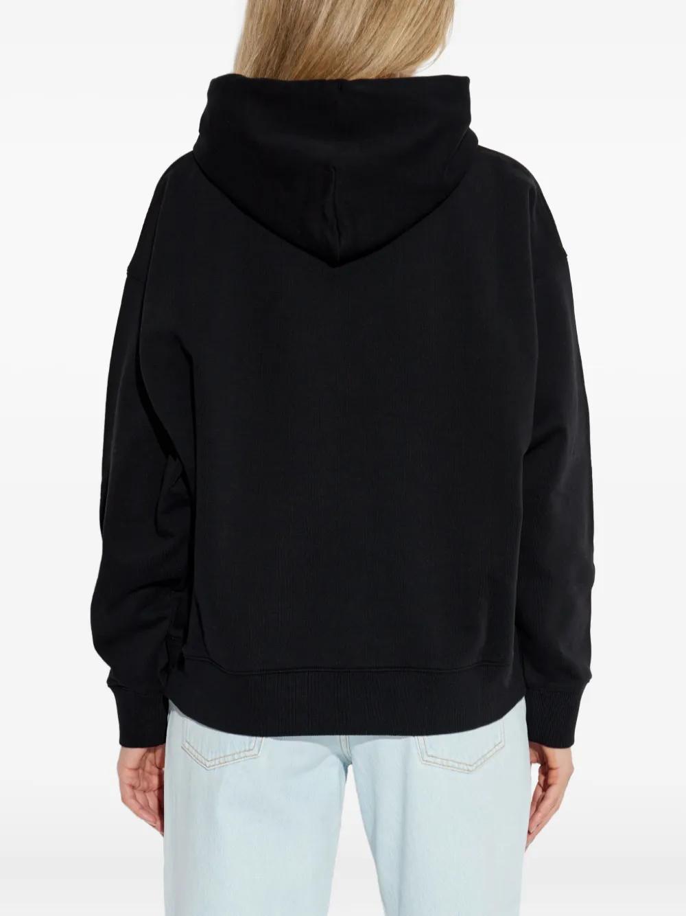 black drawstring hood front pouch-pocket silver-tone hardware ribbed hem ribbed cuffs