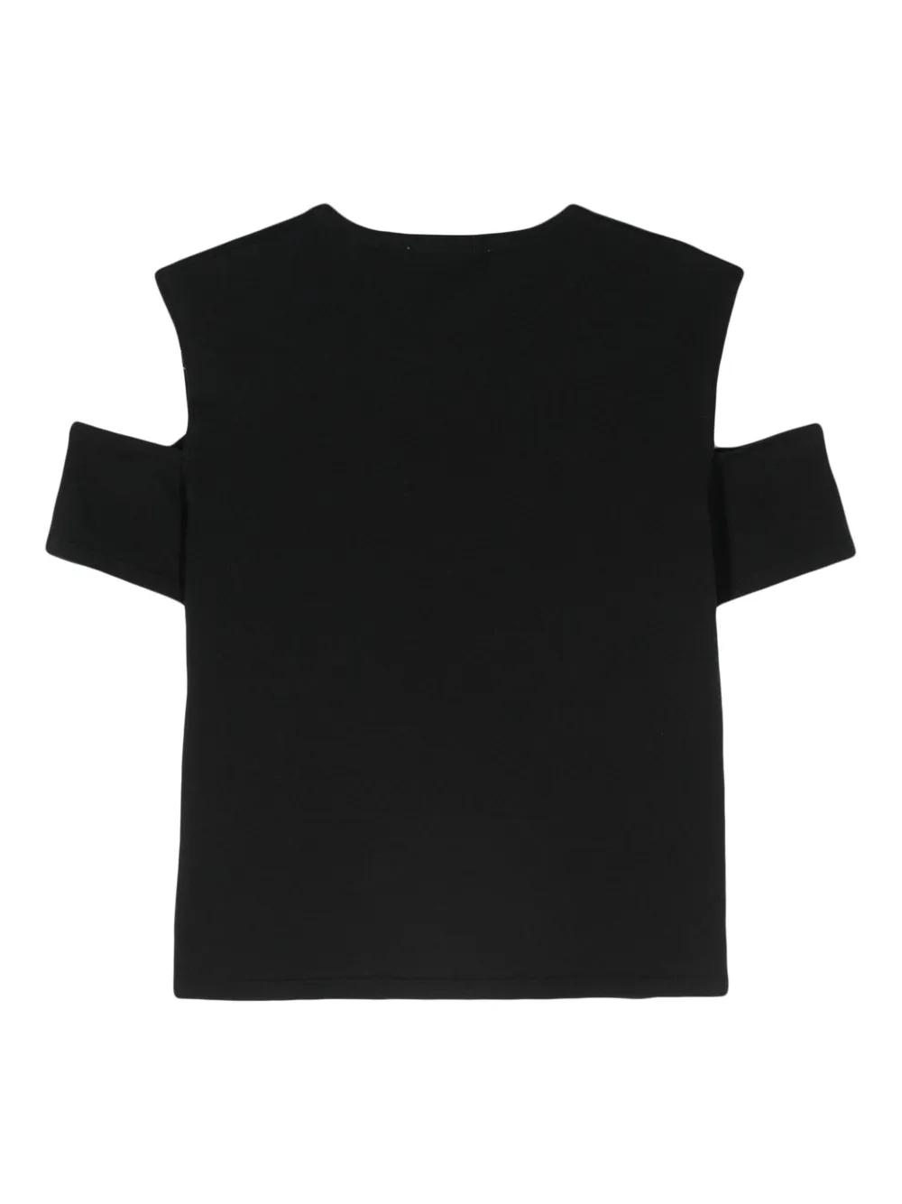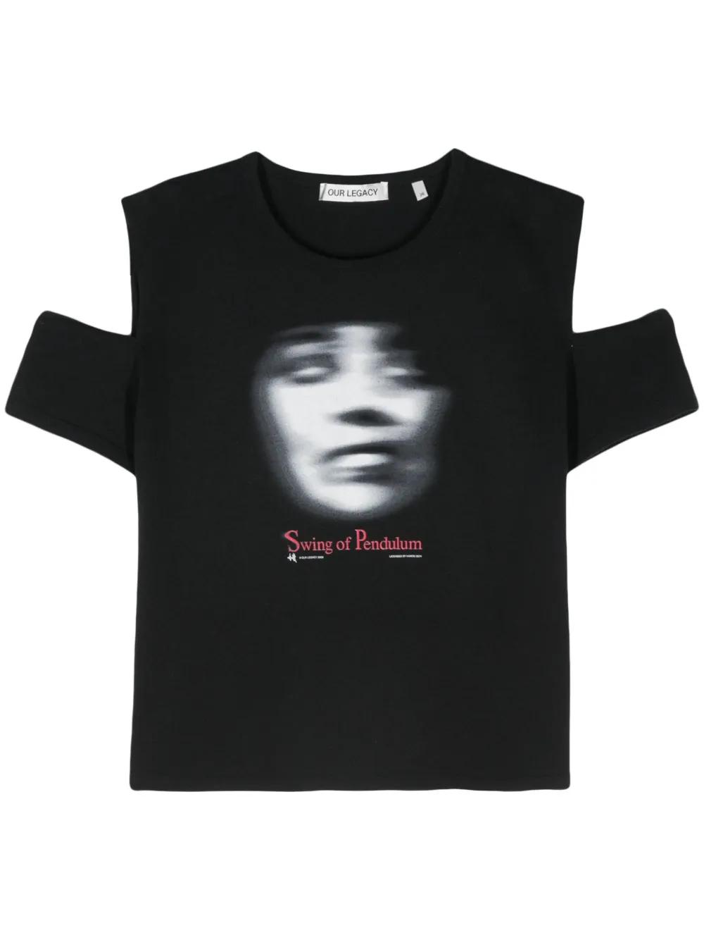 black/white/red cotton jersey texture Swing of Pendulum print to the front crew neck open-shoulder short sleeves straight hem unlined