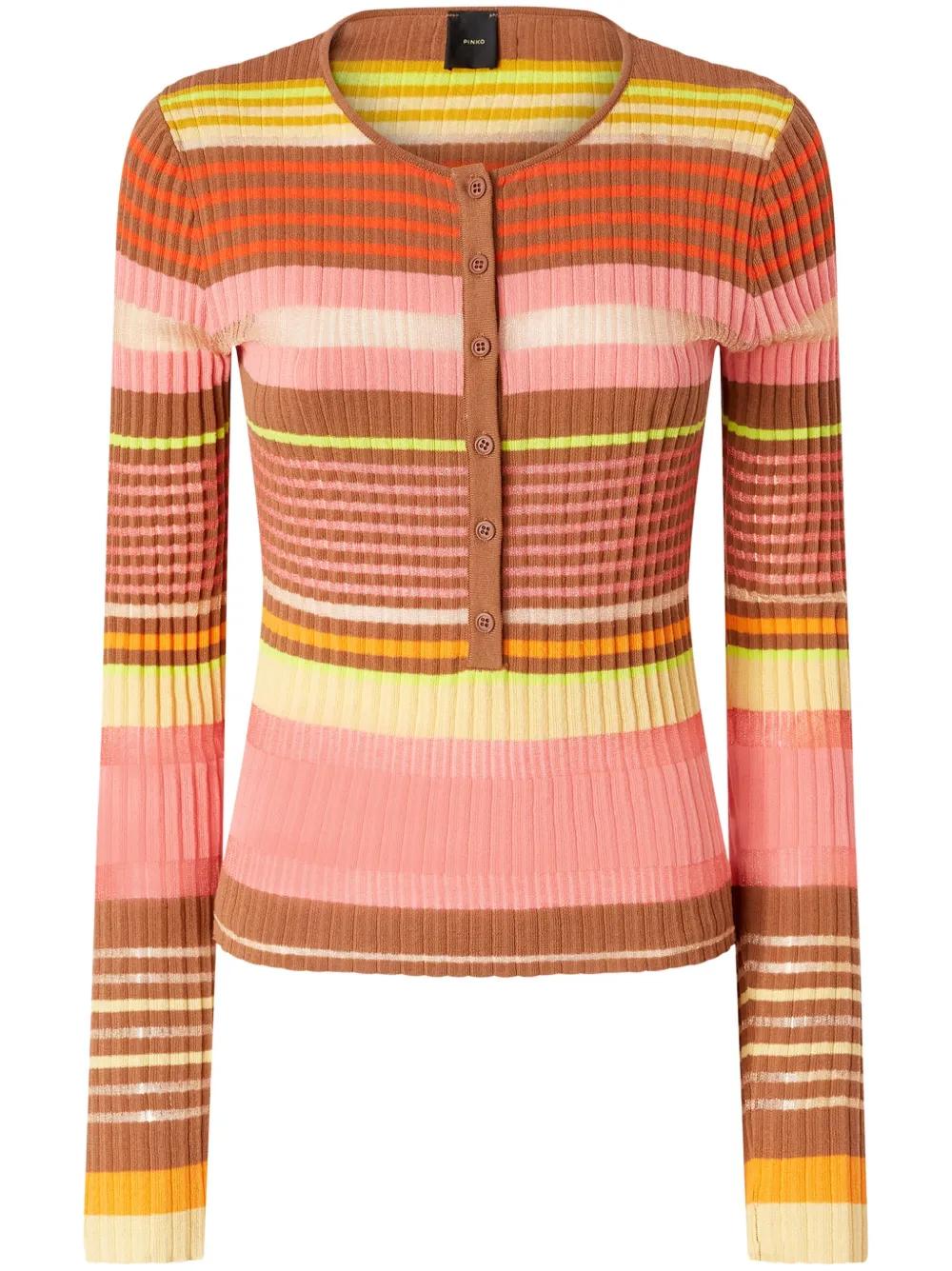 pink front button placket round neck long sleeves horizontal stripe pattern