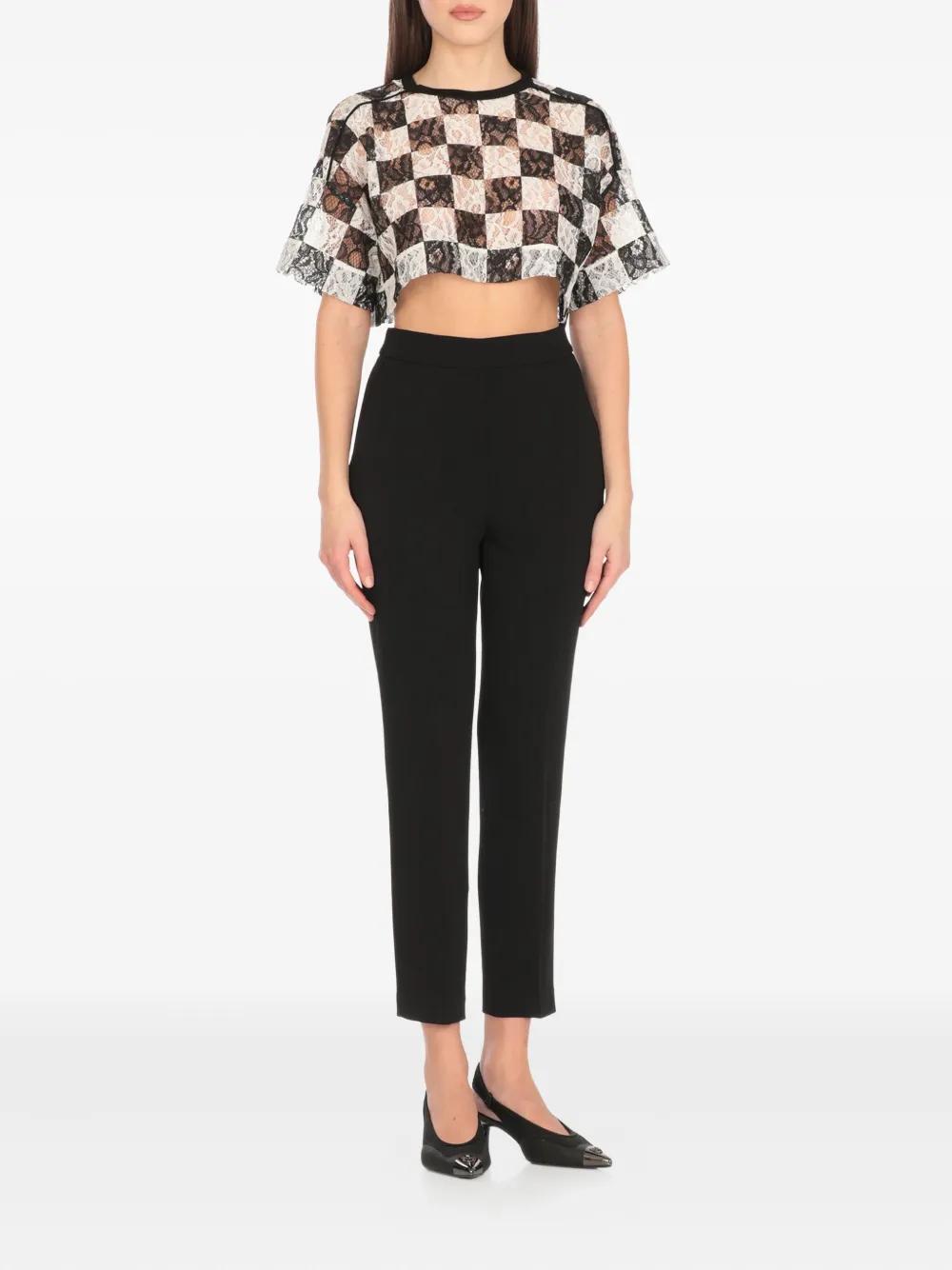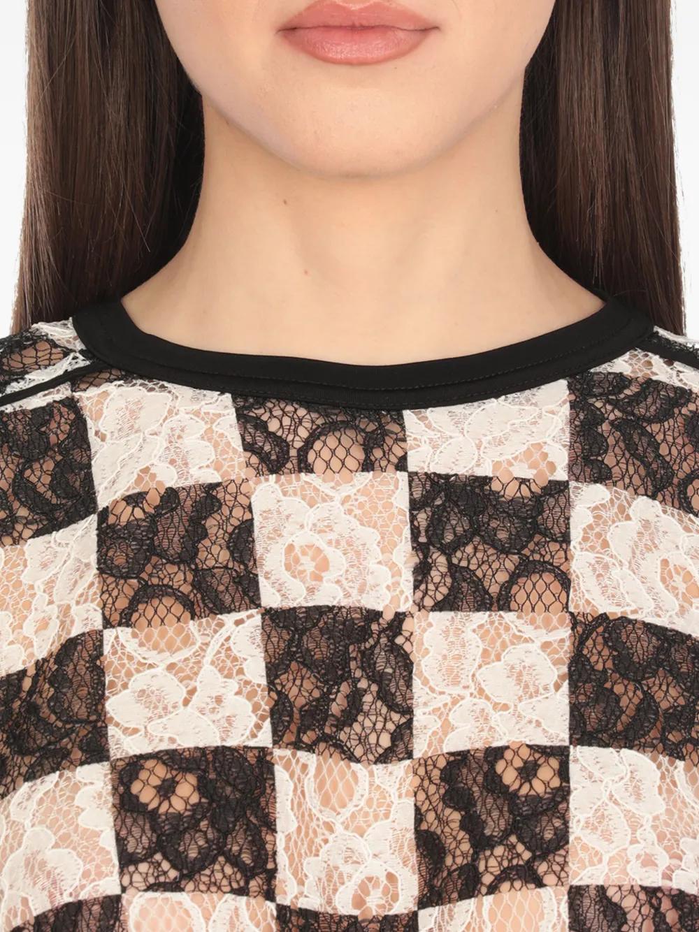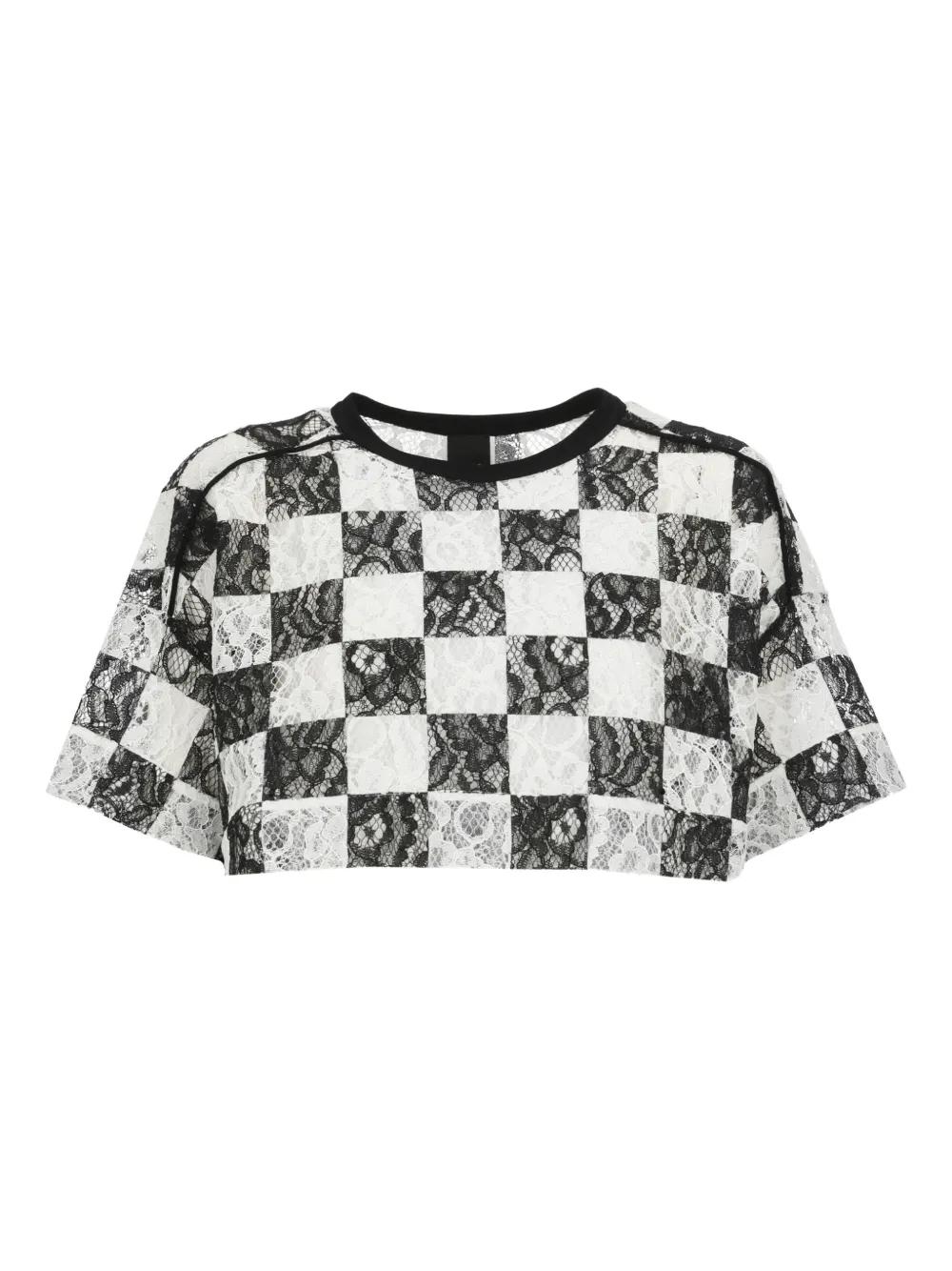black and white check pattern lace fabric round neck short sleeves cropped length