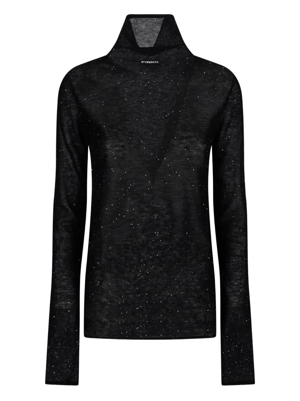 black roll neck long sleeves fine knit subtle embellishment semi-sheer fabric