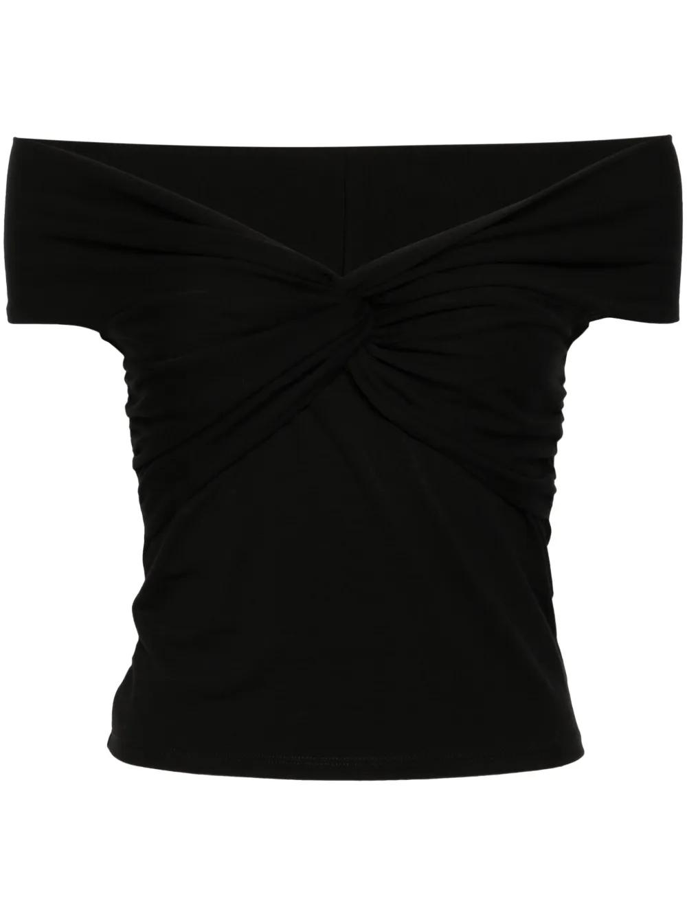 black TENCEL™ Lyocell blend lightweight jersey ruched detailing off-shoulder V-neck straight hem