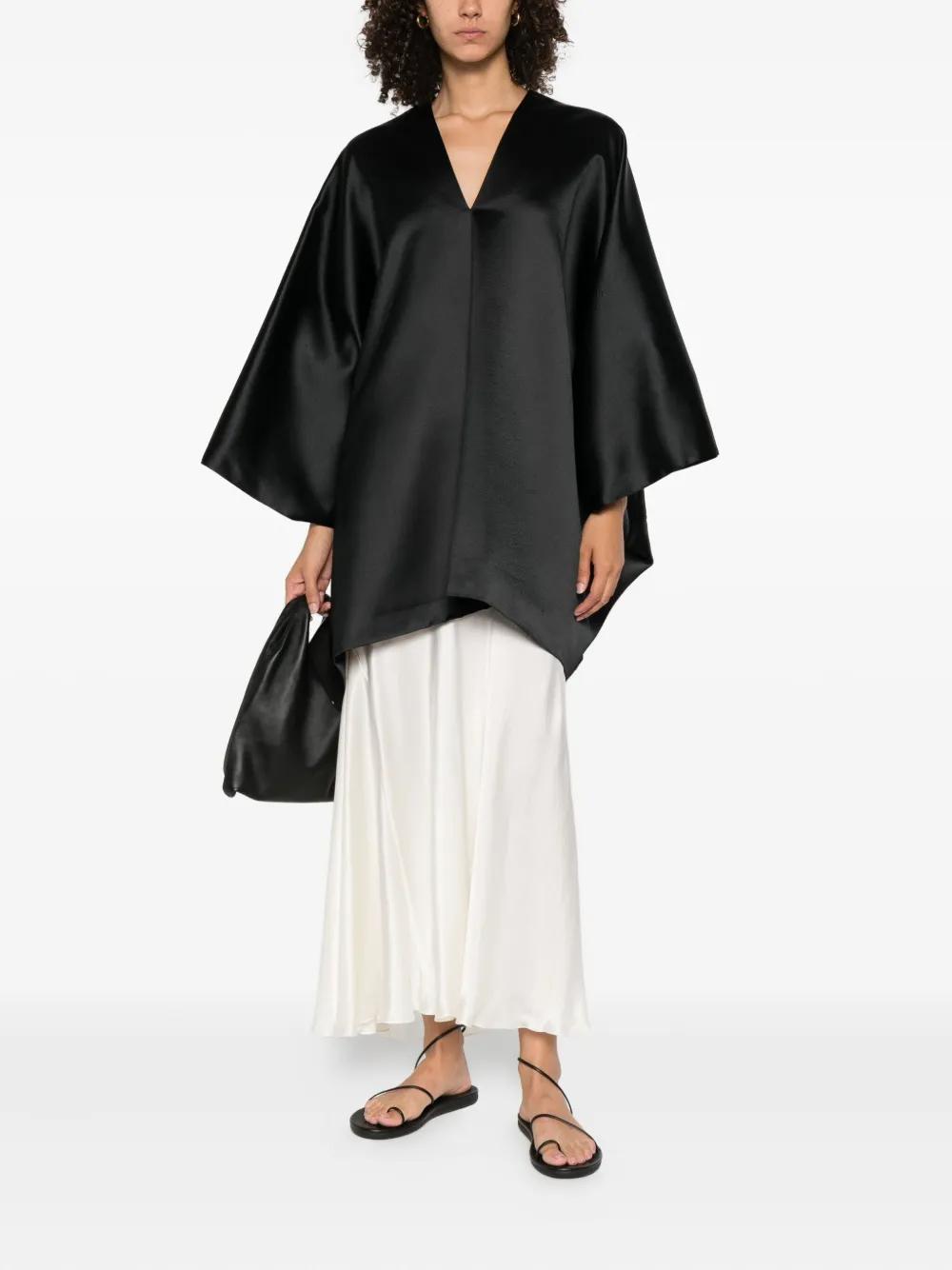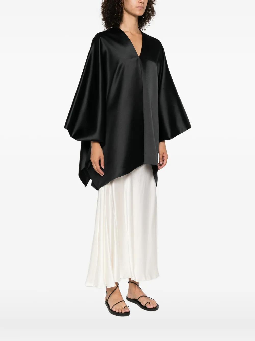 black silk V-neck asymmetric hem long sleeves flowing drape