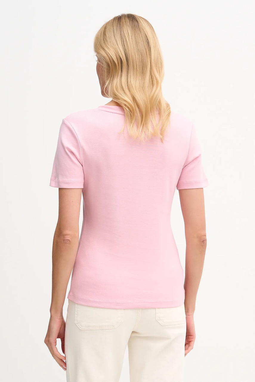 - Ten produkt został uszyty z certyfikowanej bawełny organicznej, która jest uprawiana i zbierana z roślin niezmodyfikowanych genetycznie, bez użycia chemicznych nawozów pestycydów. - Fason slim. - Spiczasty, prążkowany dekolt. - Krótki rękaw. - Haftowane logo. - Długość: 63 cm. - Szerokość pod pachami: 42,5 cm. - Wymiary podane dla rozmiaru: S.