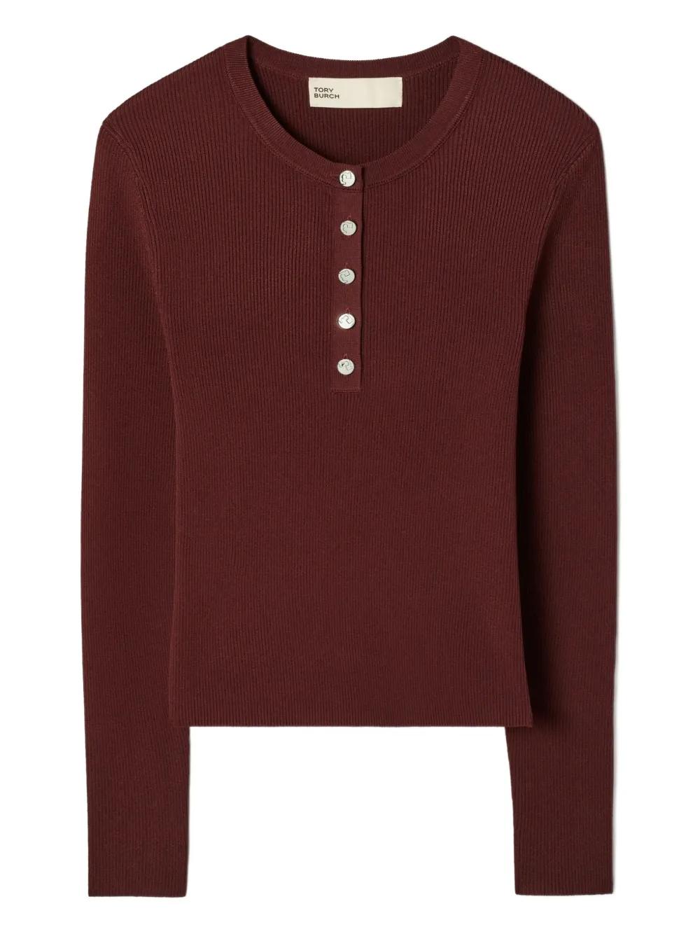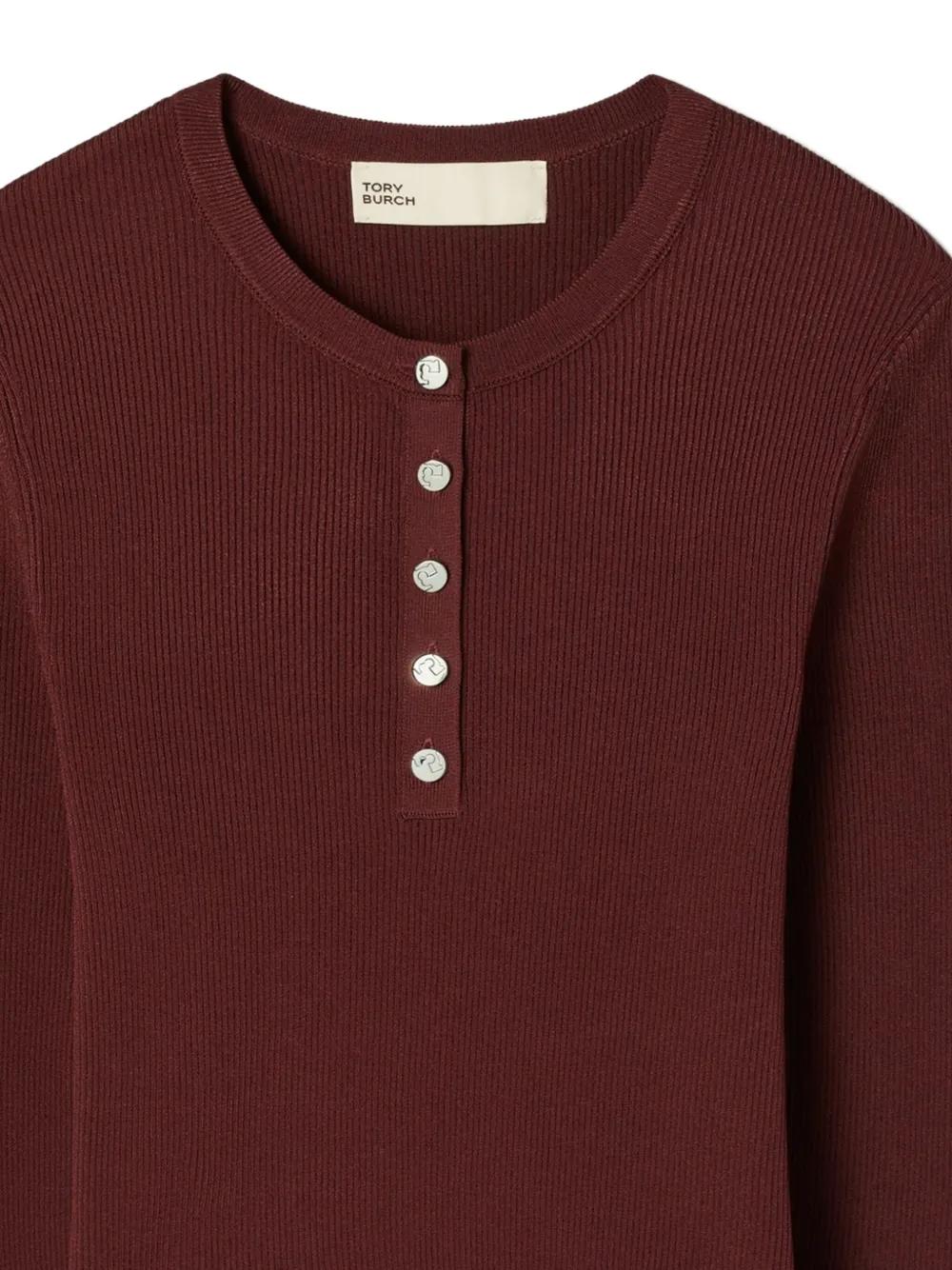 dark red ribbed texture henley neckline button placket long sleeves close-fitting