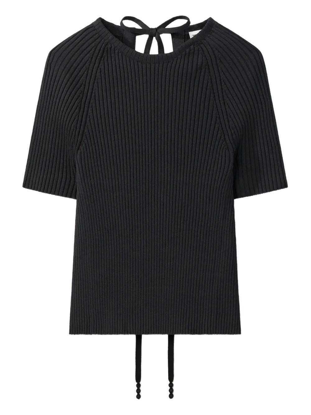 black ribbed texture short sleeves tie fastening at back round neck raglan sleeves