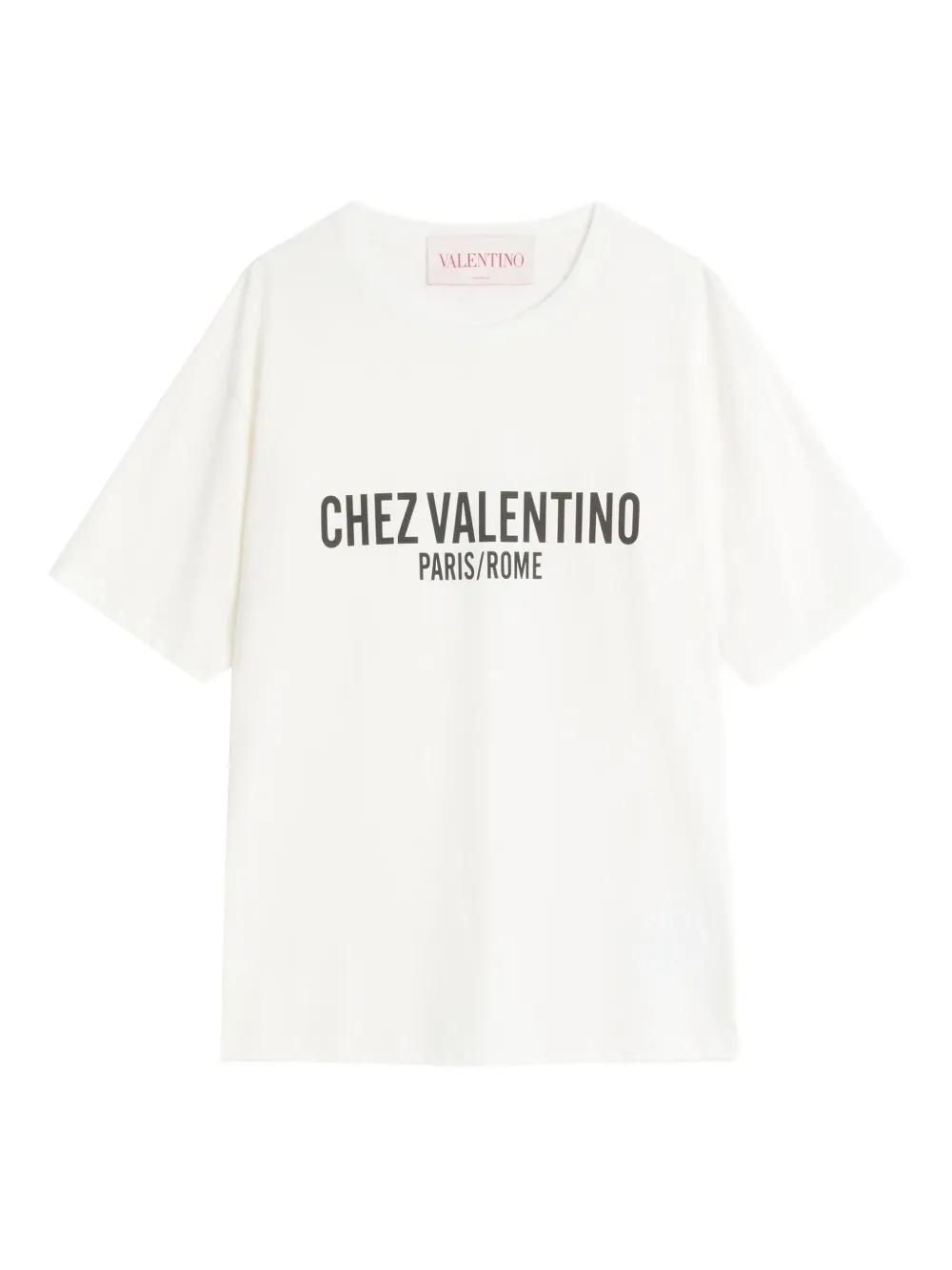 white cotton Chez print at the chest dropped shoulder round neck short sleeves straight hem